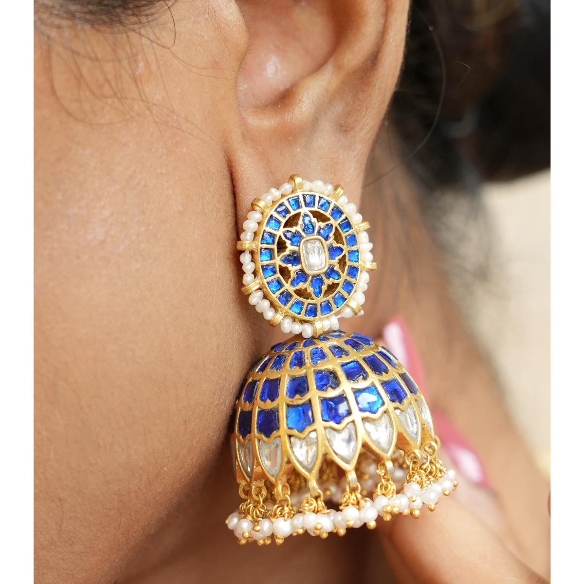 This 92.5 Silver, 24 kt Gold-Plated Earring is adorned with Semi-precious Kundan Stones for a luxurious aesthetic.