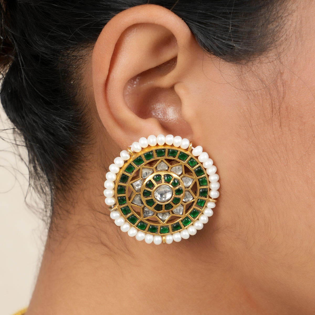 This 92.5 Silver, 24 kt Gold-Plated Earring is adorned with Semi-precious Kundan Stones for a luxurious aesthetic.