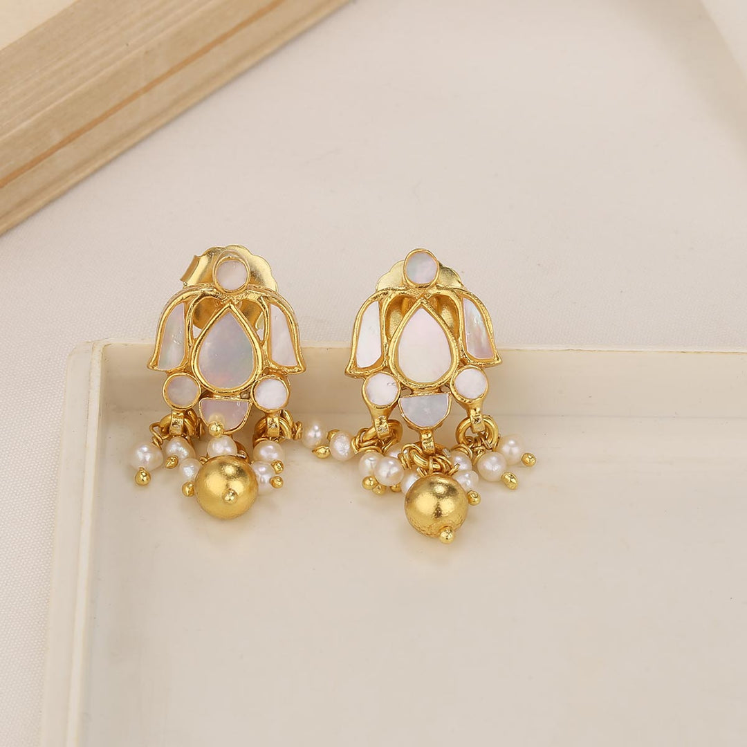 Gold Plated Silver Kundan Earrings | Gold Plated Stone Studs | Silver Pearls Earrings