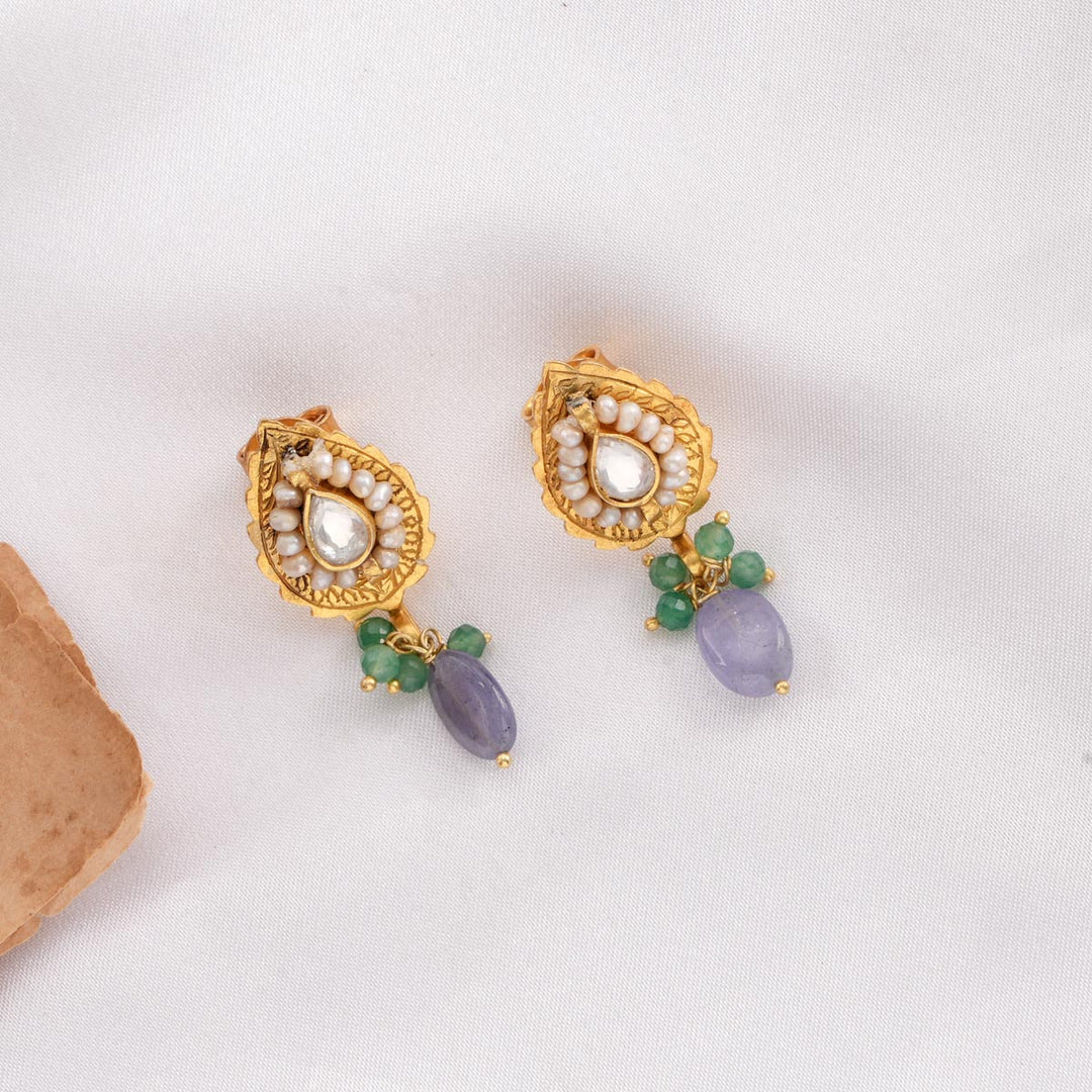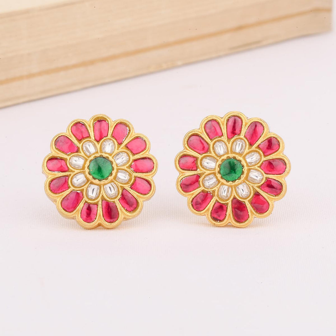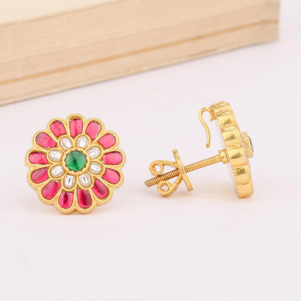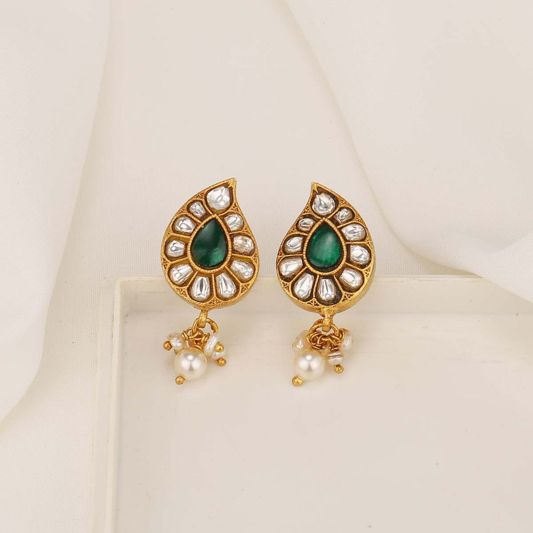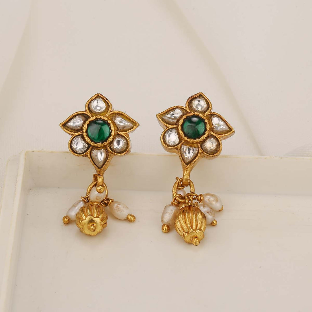 Gold Plated Silver Kundan Earrings | Gold Plated Stone Studs | Silver Pearls Earrings