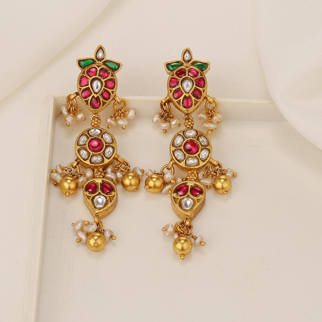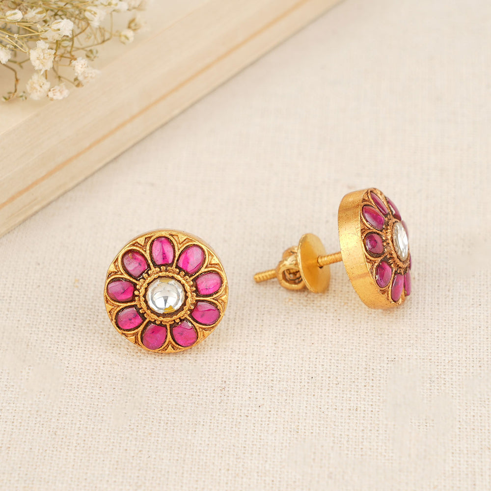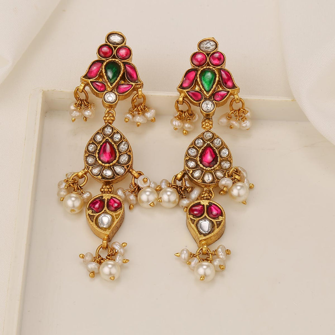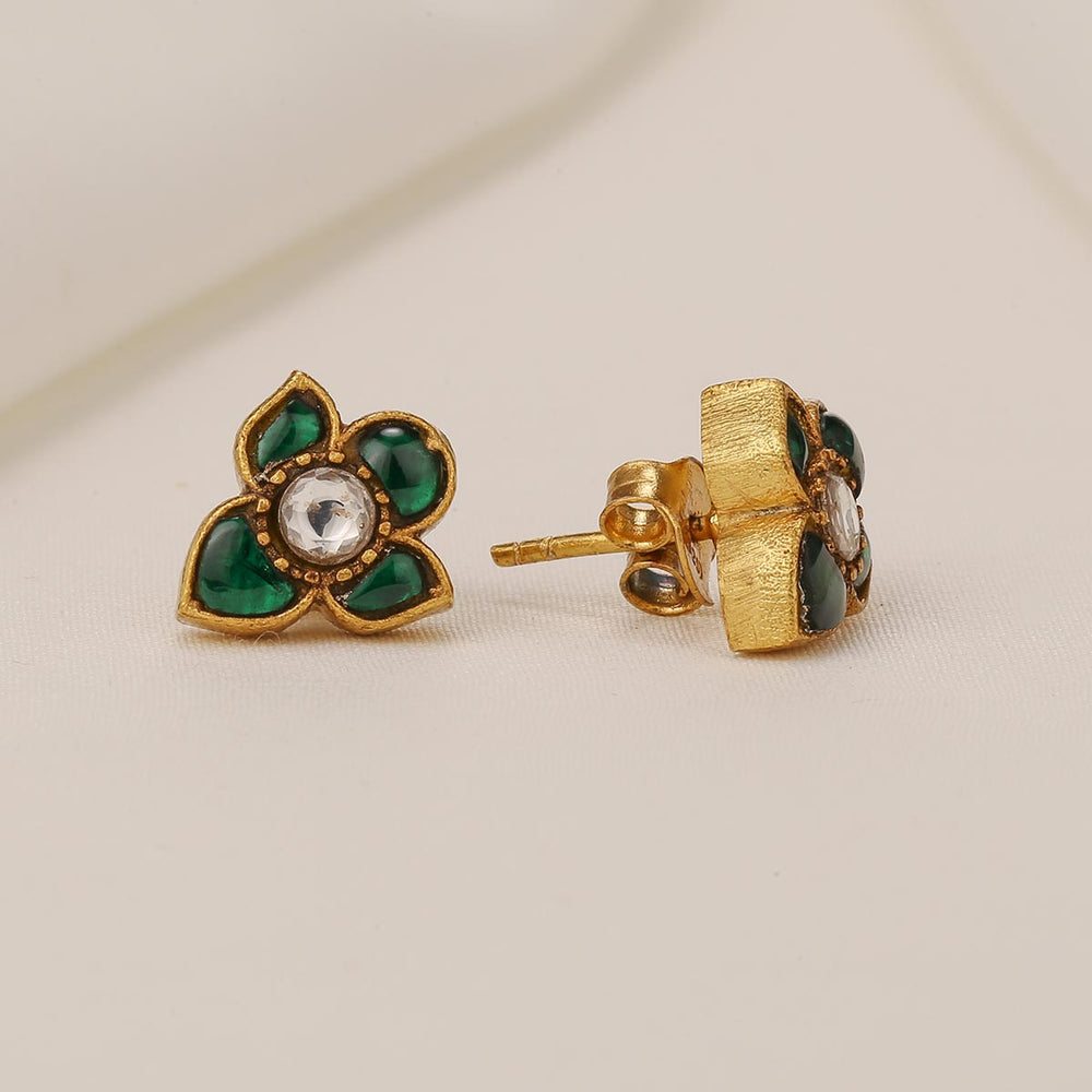 Gold Plated Silver Kundan Earrings | Gold Plated Stone Studs | Silver Pearls Earrings