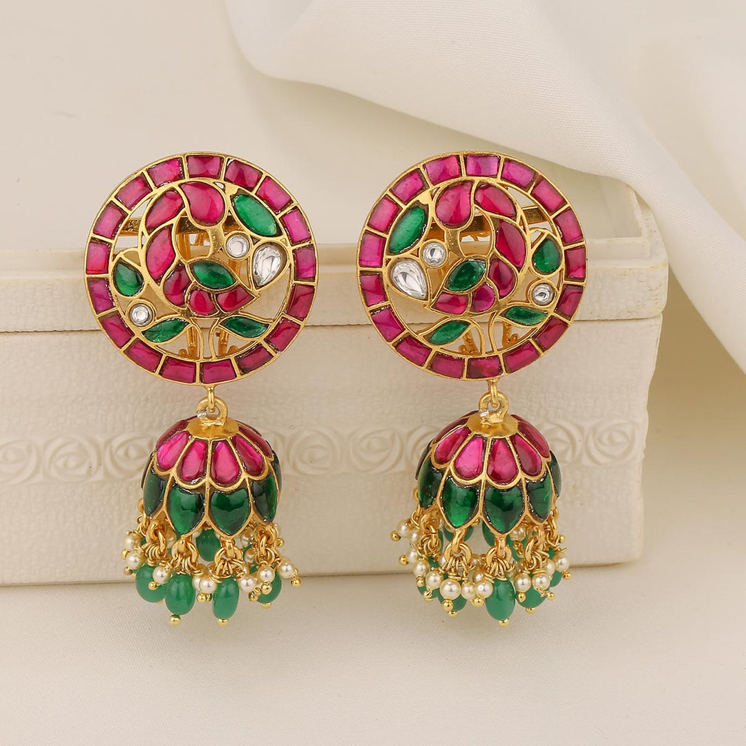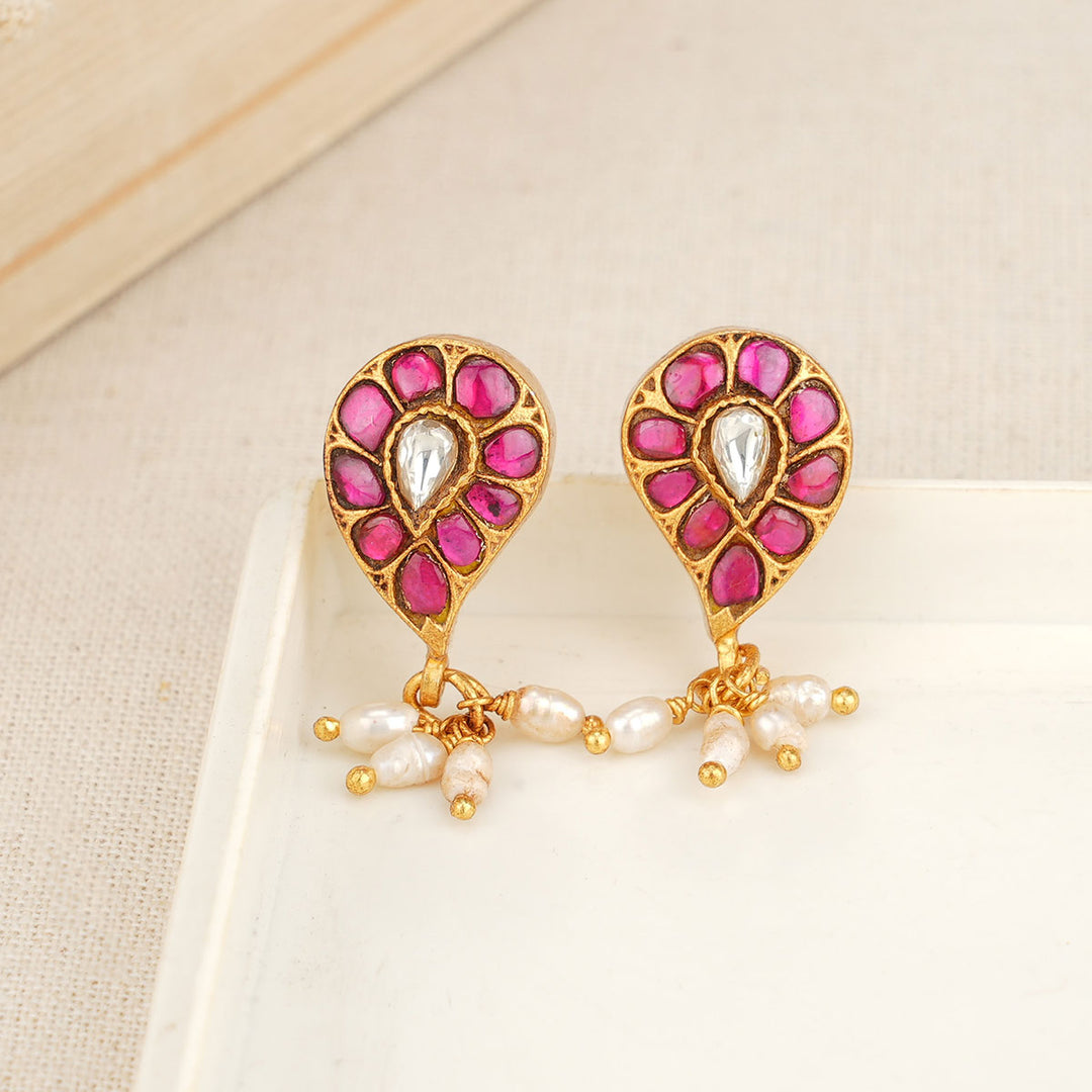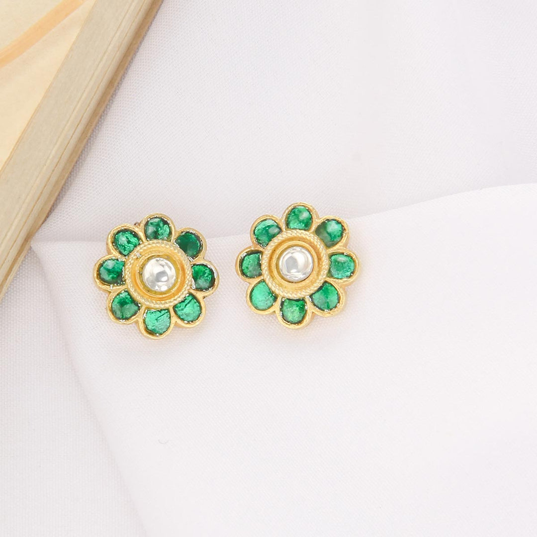 Gold Plated Silver Kundan Earrings | Gold Plated Stone Studs | Silver Pearls Earrings