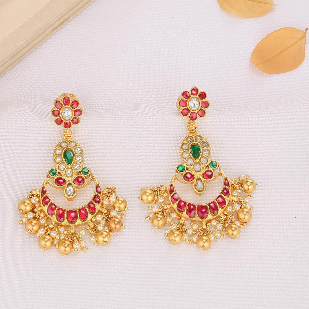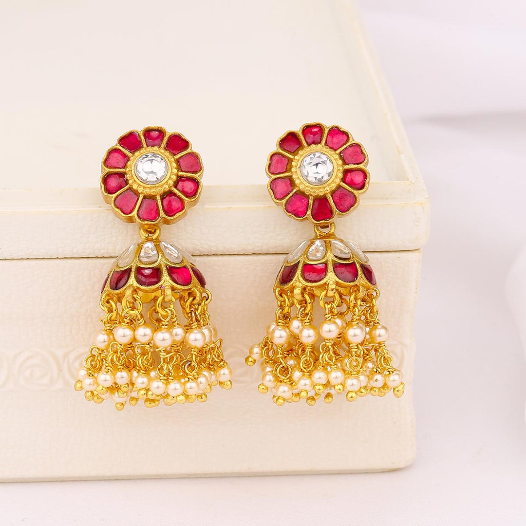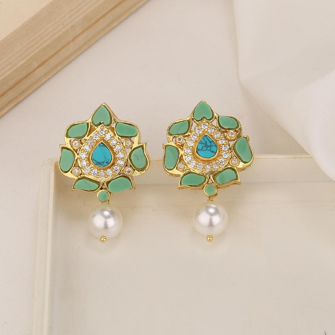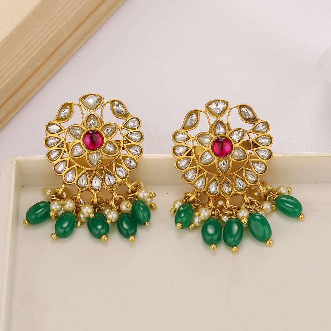 Gold Plated Silver Kundan Earrings | Gold Plated Stone Studs | Silver Pearls Earrings