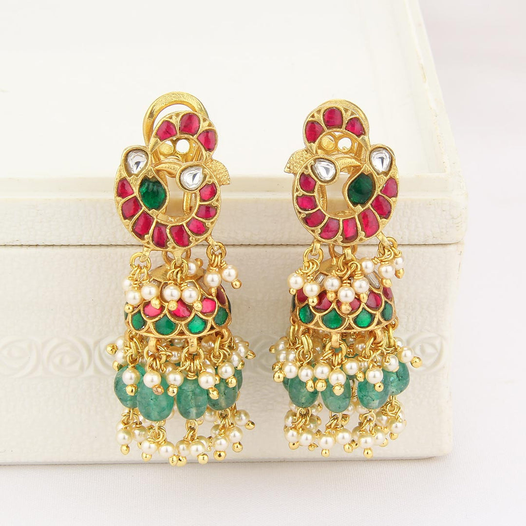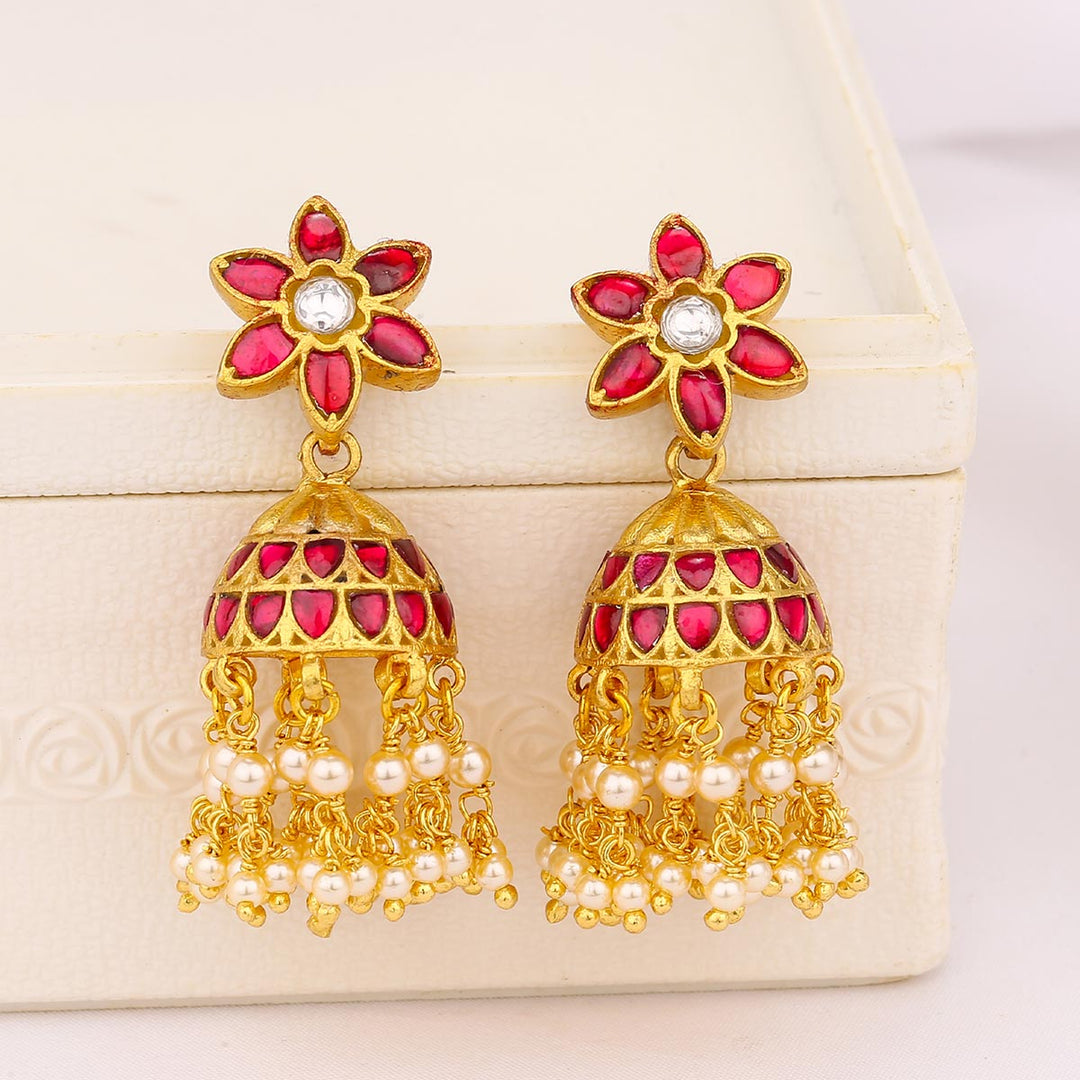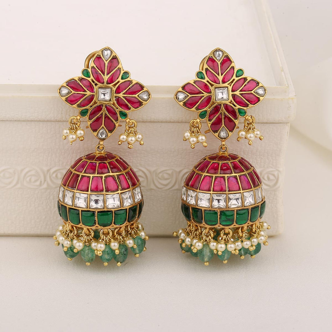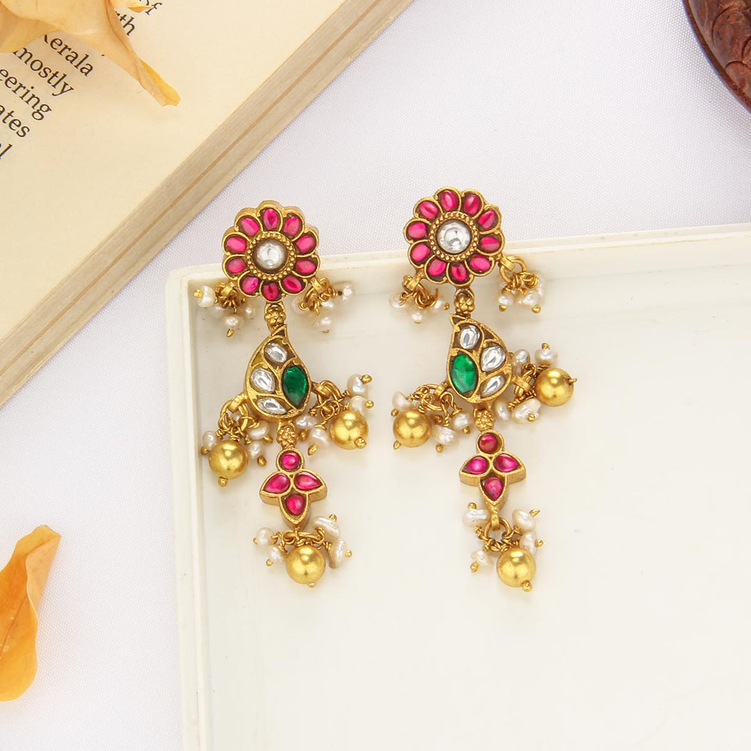 Gold Plated Silver Kundan Earrings | Gold Plated Stone Studs | Silver Pearls Earrings