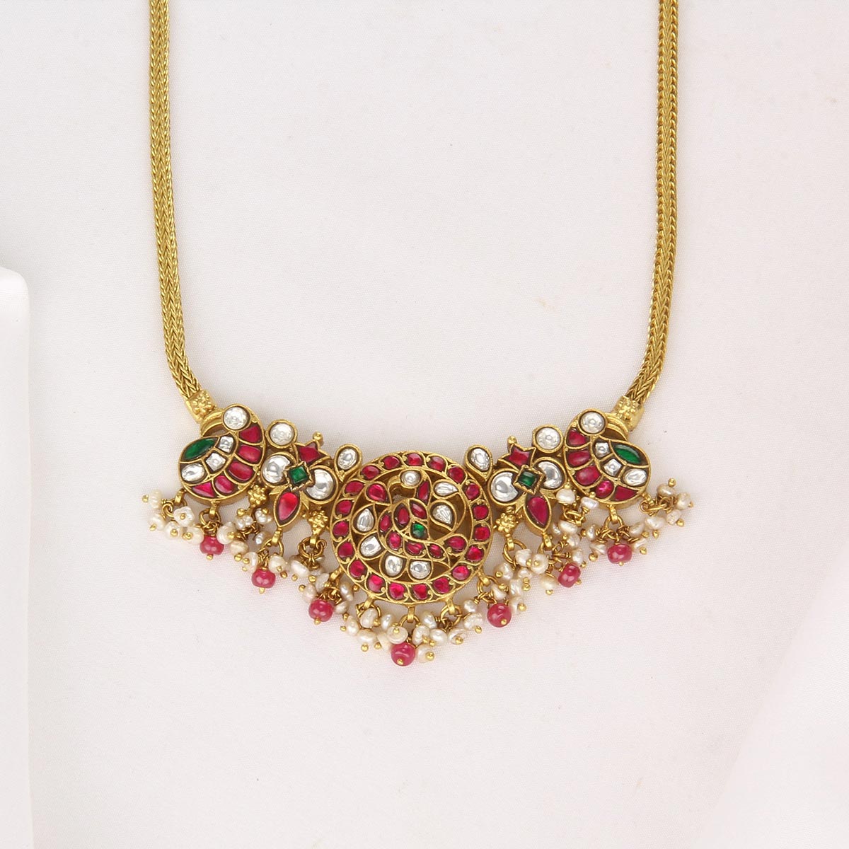 This 92.5 Silver, 24kt gold-plated necklace is adorned with semi-precious kundan stones for a luxurious aesthetic.