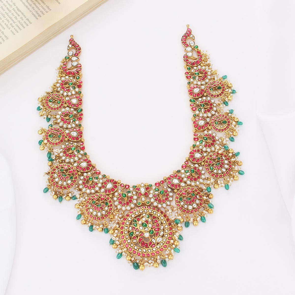 This 92.5 Silver, 24 kt Gold-Plated Necklace is adorned with Semi-precious Kundan Stones for a luxurious aesthetic.