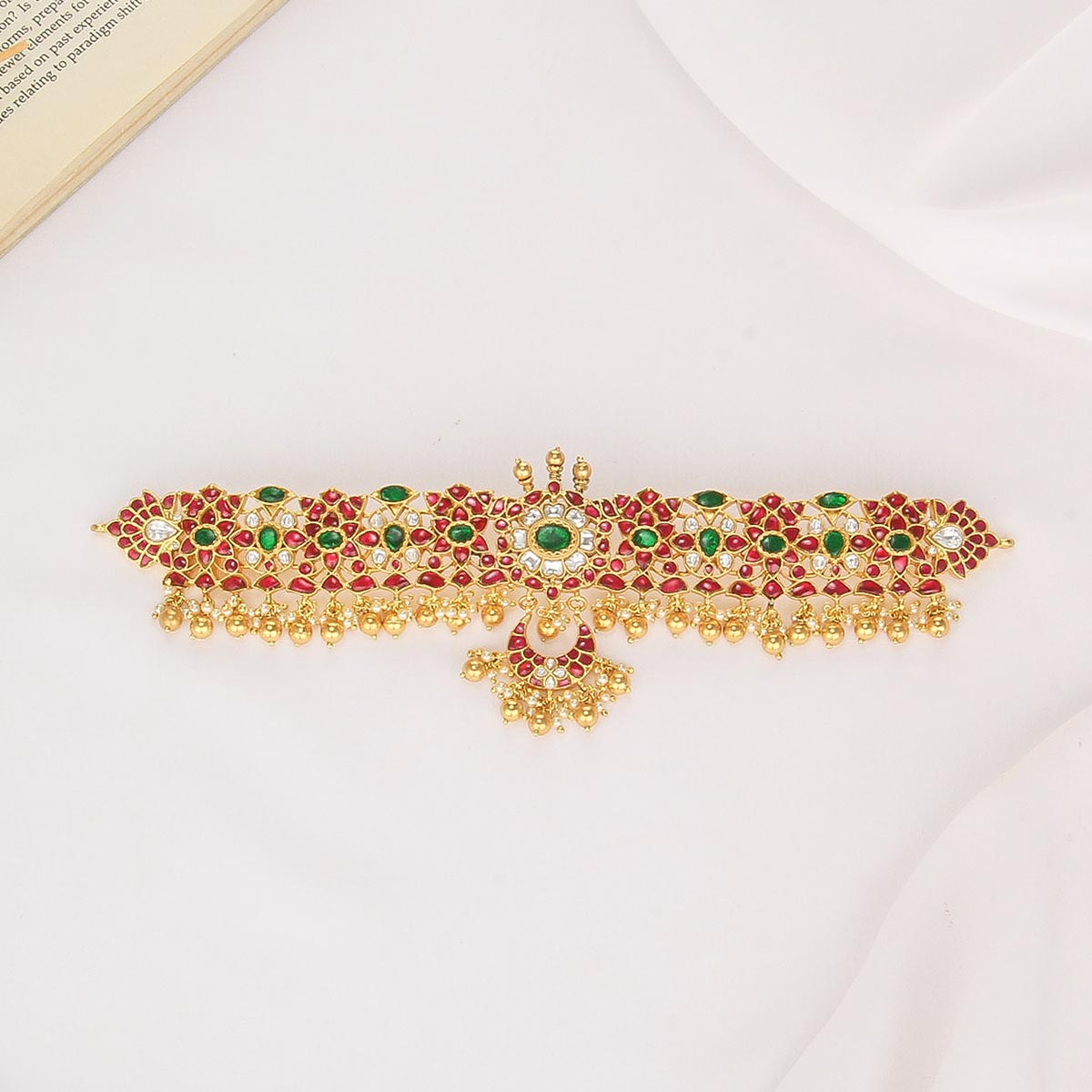 This 92.5 Silver, 24 kt Gold-Plated Choker is adorned with Semi-precious Kundan Stones for a luxurious aesthetic.