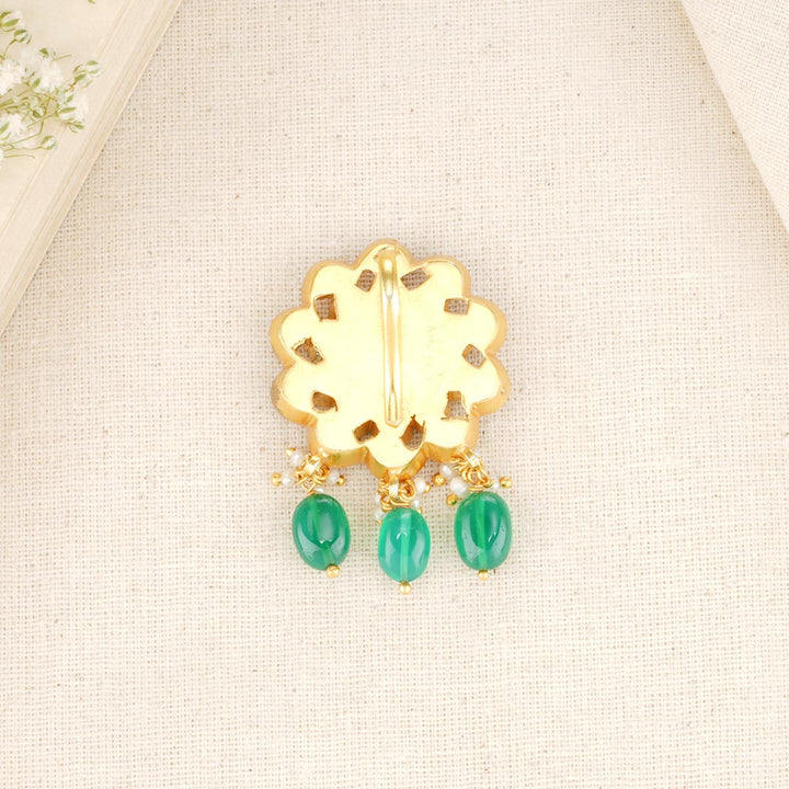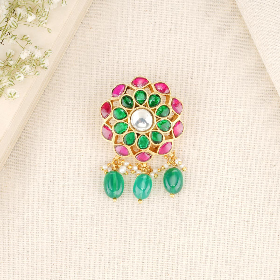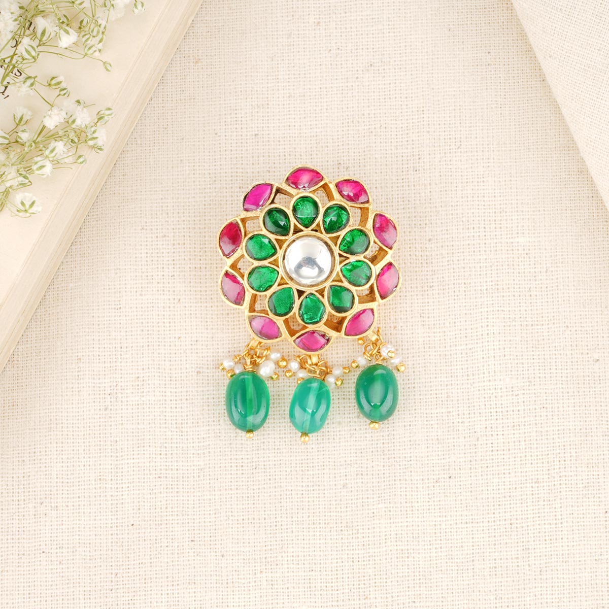 This 92.5 Silver, 24 kt Gold-Plated Pendant is adorned with Semi-precious Kundan Stones for a luxurious aesthetic.