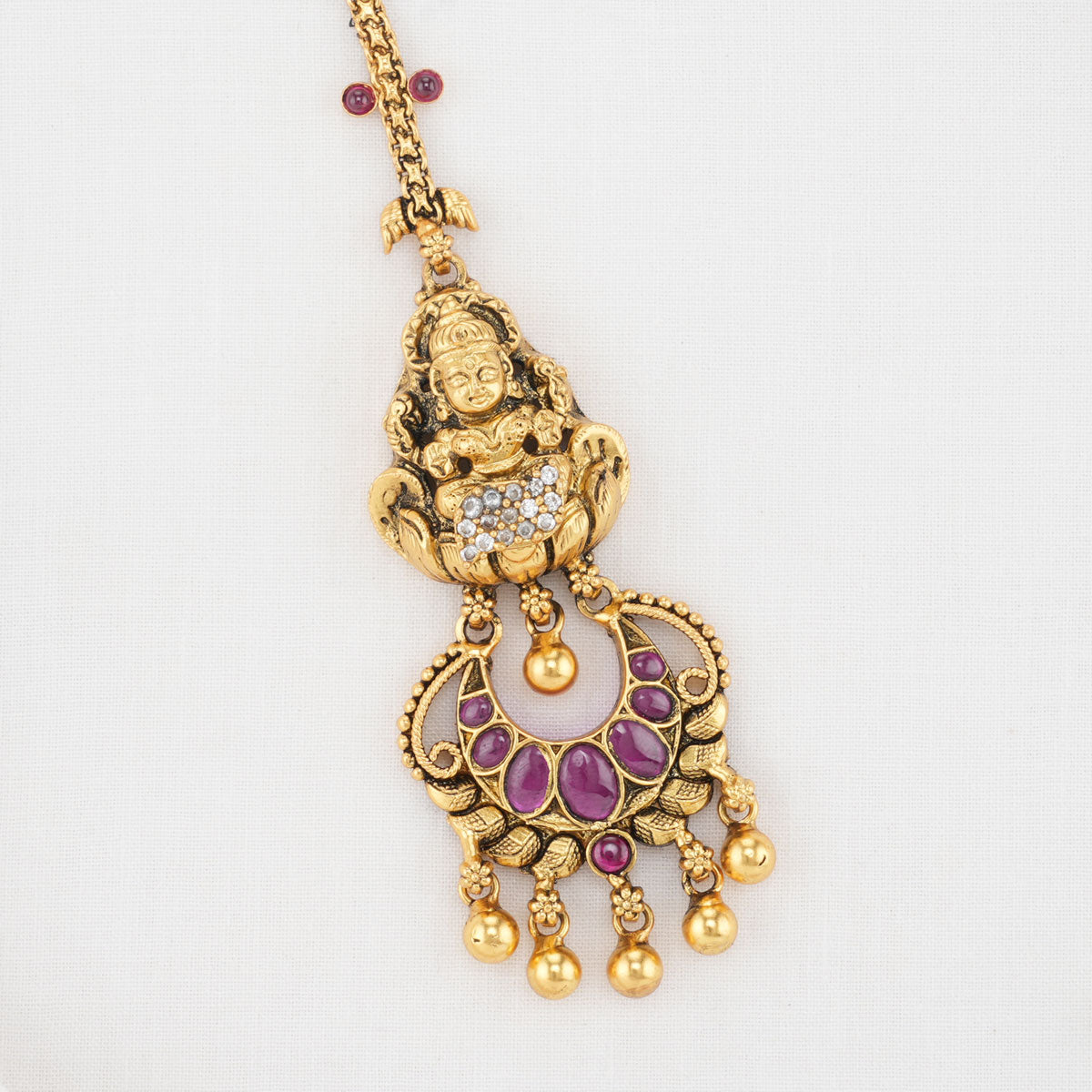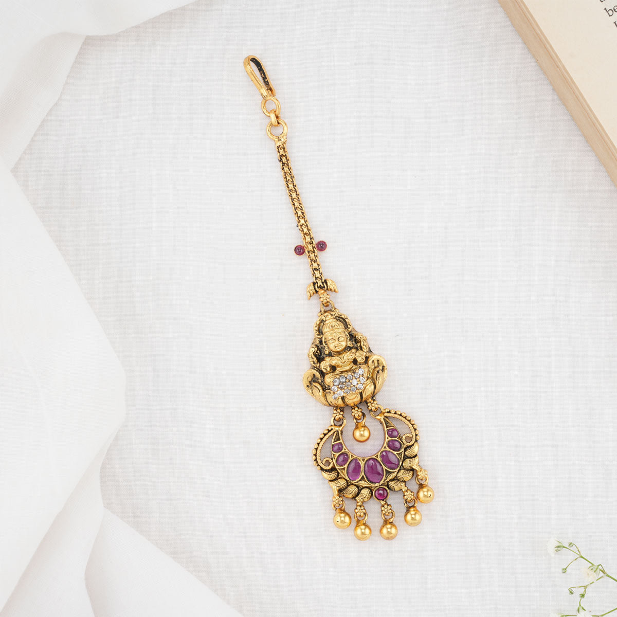 This exquisite Maangtikka will add a glamorous flair to your look. Crafted from 92.5 silver and 24kt gold-plated, it features semi-precious stones for a brilliant shine. Elevate your look with this luxurious Maangtikka.