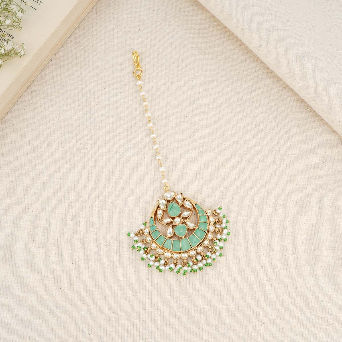 This Kundan Maangtikka is crafted with 92.5 silver-gold plating. It will add a sophisticated touch to any special occasion look. With its timeless elegance, it is sure to make an eye-catching statement.