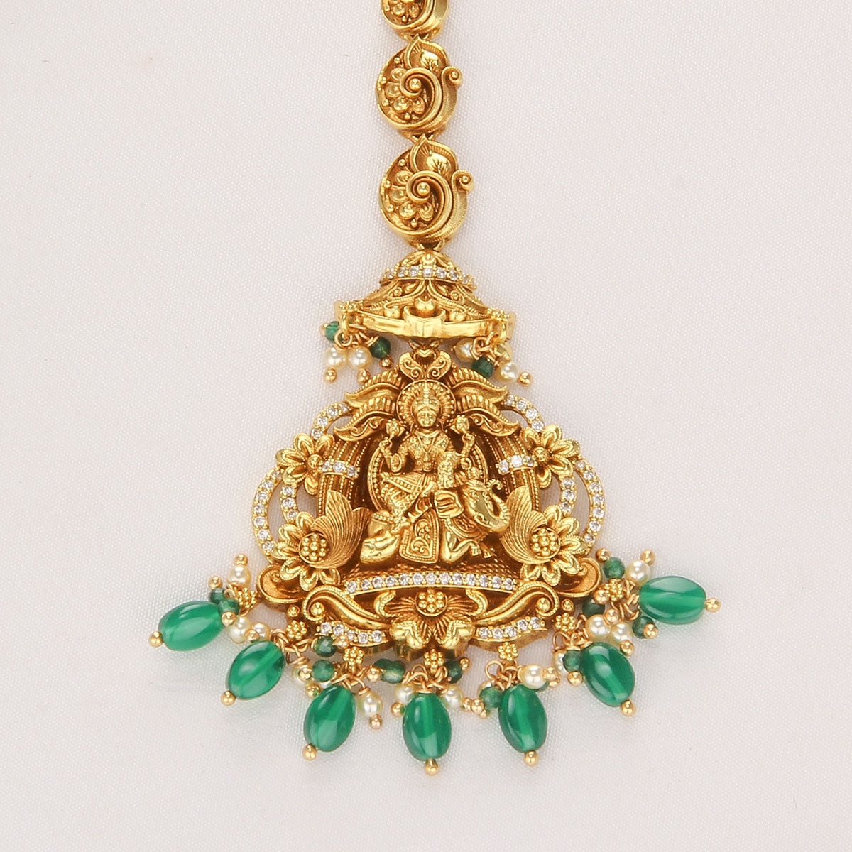 This exquisite Maangtikka will add a glamorous flair to your look. Crafted from 92.5 silver and 24kt gold-plated, it features semi-precious stones for a brilliant shine. Elevate your look with this luxurious Maangtikka.