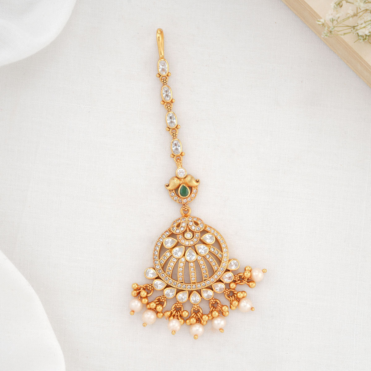 The Maangtikka is a statement piece crafted from 92.5 Sterling silver and 24kt Gold plated for exceptional quality. The design is further embellished with semi-precious stones for an eye-catching finish. A perfect pick for any special occasion.