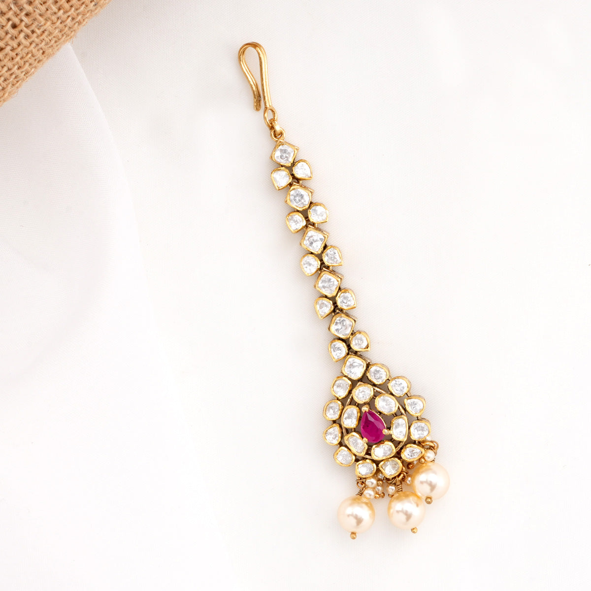 The Maangtikka is a statement piece crafted from 92.5 Sterling silver and 24kt Gold plated for exceptional quality. The design is further embellished with semi-precious stones for an eye-catching finish. A perfect pick for any special occasion.