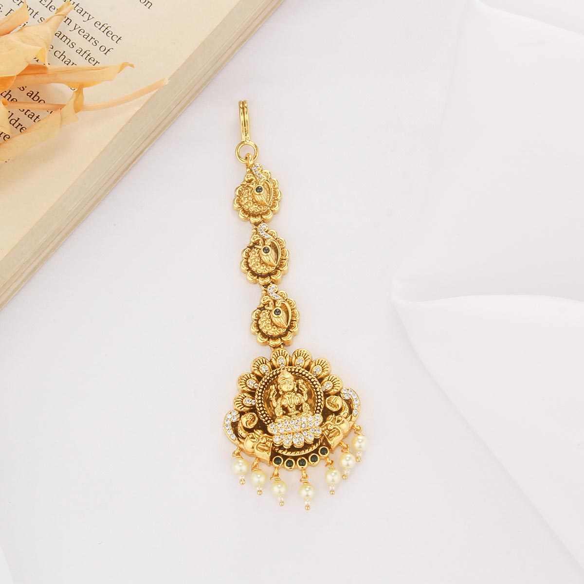 This exquisite Maangtikka will add a glamorous flair to your look. Crafted from 92.5 silver and 24kt gold-plated, it features semi-precious stones for a brilliant shine. Elevate your look with this luxurious Maangtikka.