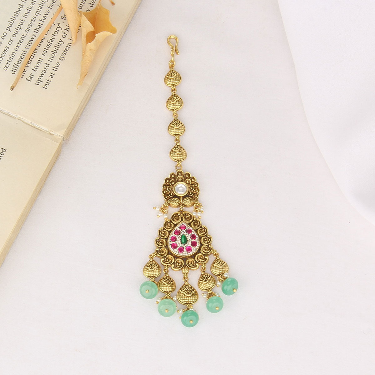 This exquisite Maangtikka will add a glamorous flair to your look. Crafted from 92.5 silver and 24kt gold-plated, it features semi-precious stones for a brilliant shine. Elevate your look with this luxurious Maangtikka.