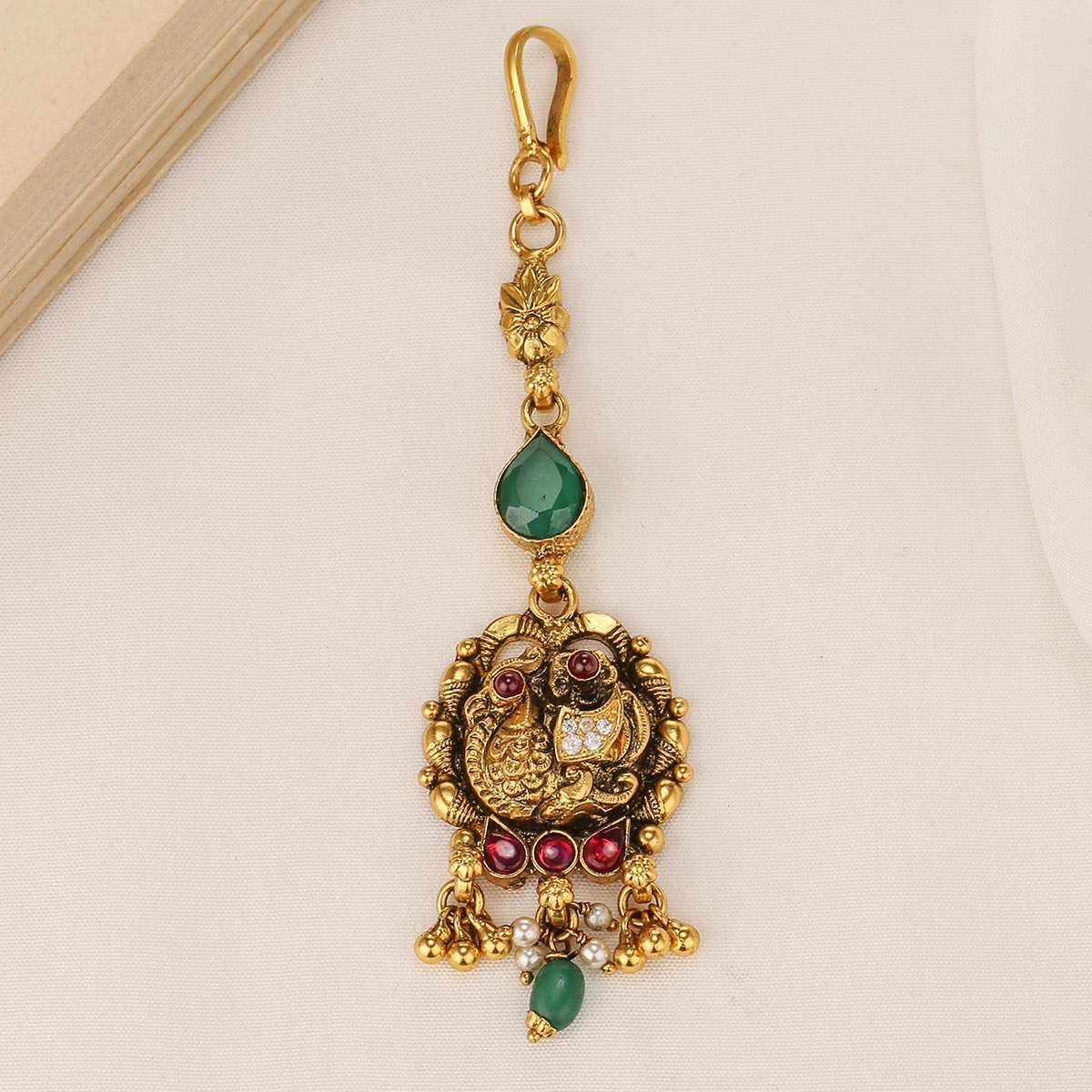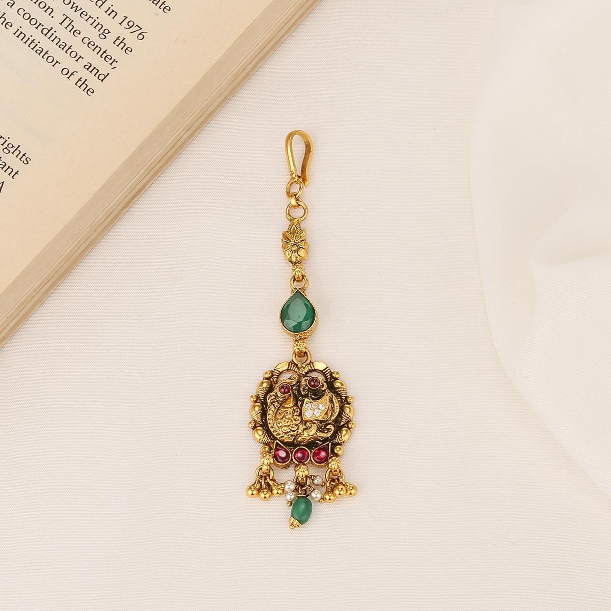This exquisite Maangtikka will add a glamorous flair to your look. Crafted from 92.5 silver and 24kt gold-plated, it features semi-precious stones for a brilliant shine. Elevate your look with this luxurious Maangtikka.