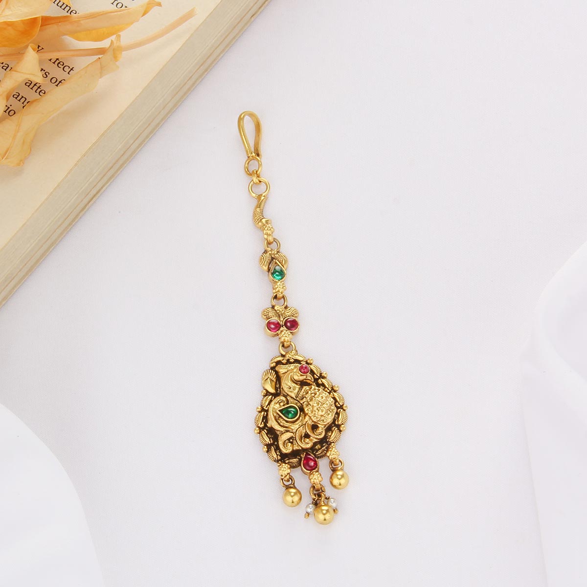 This exquisite Maangtikka will add a glamorous flair to your look. Crafted from 92.5 silver and 24kt gold-plated, it features semi-precious stones for a brilliant shine. Elevate your look with this luxurious Maangtikka.