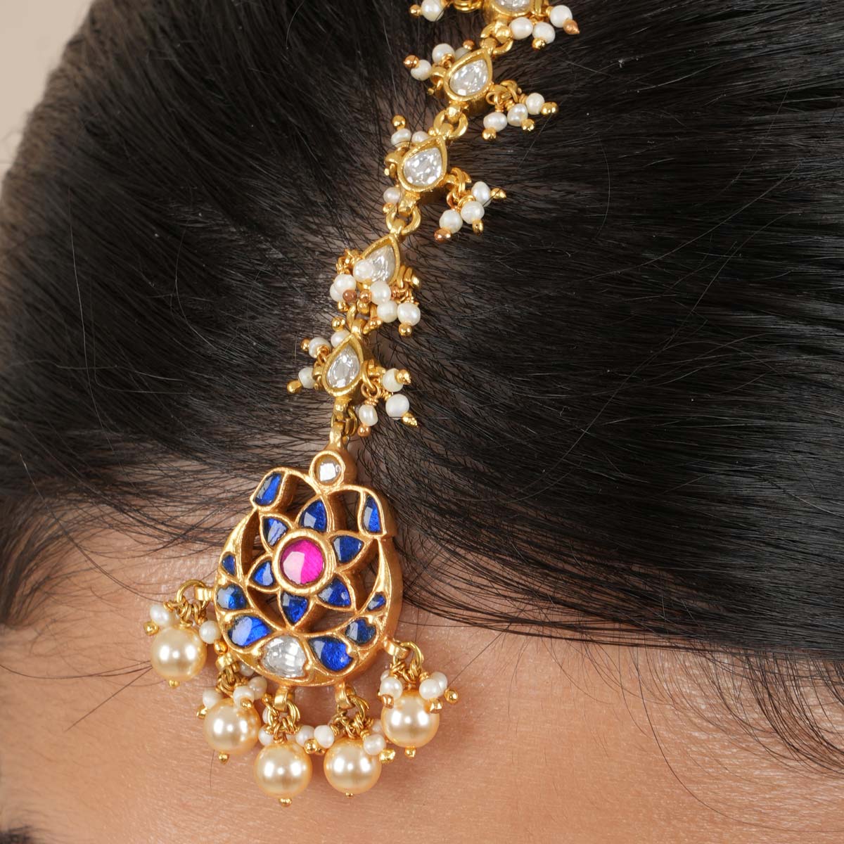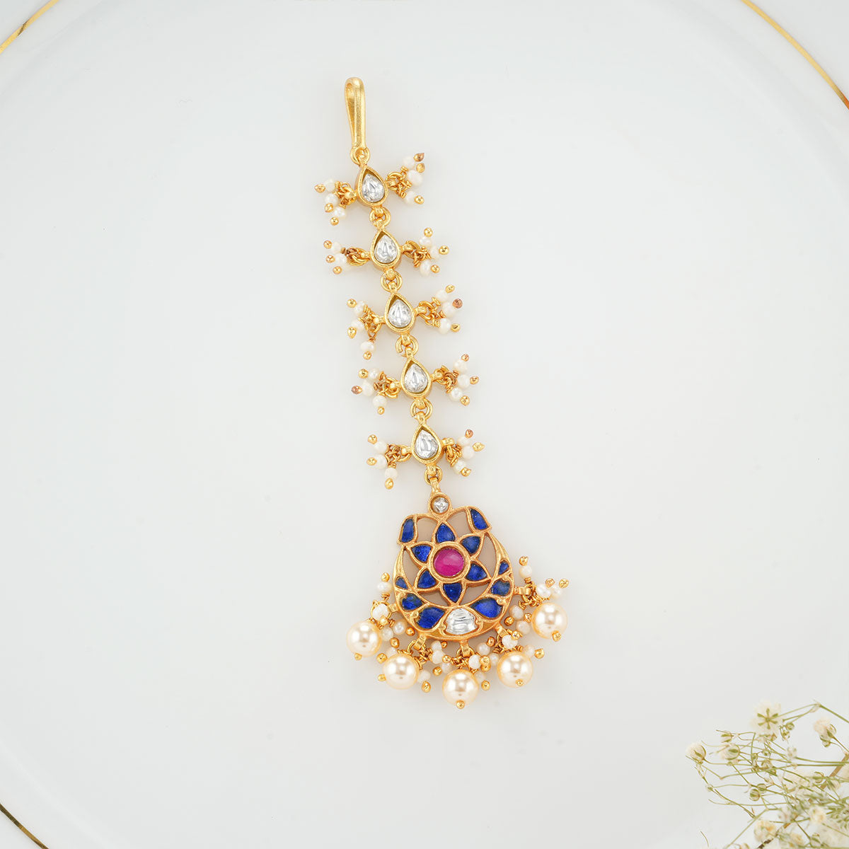 This 92.5 Silver, 24 kt Gold-Plated Maangtikka is adorned with Semi-precious Kundan Stones for a luxurious aesthetic.