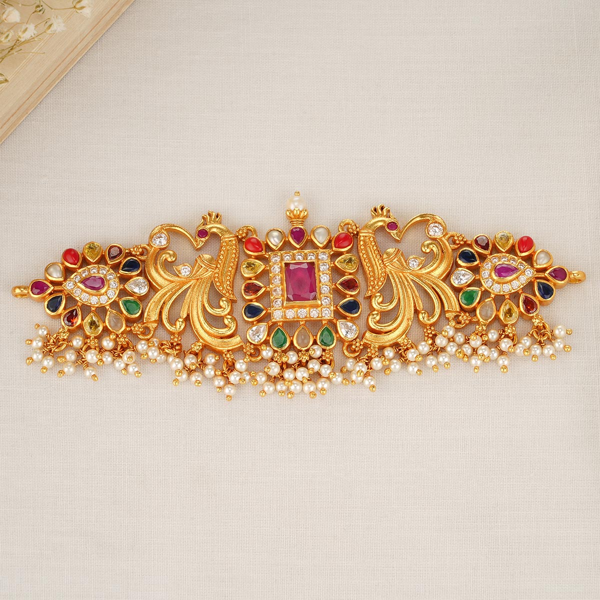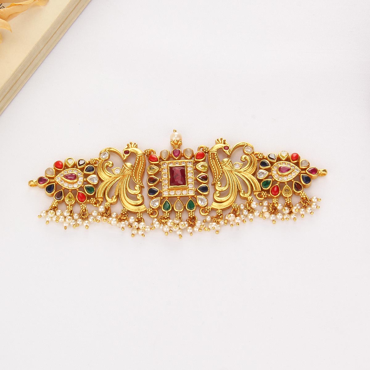 This 92.5 Silver, 24 kt gold-plated stylish Necklace is studded with semi-precious stones to make a stunning statement. Perfect for any special occasion.