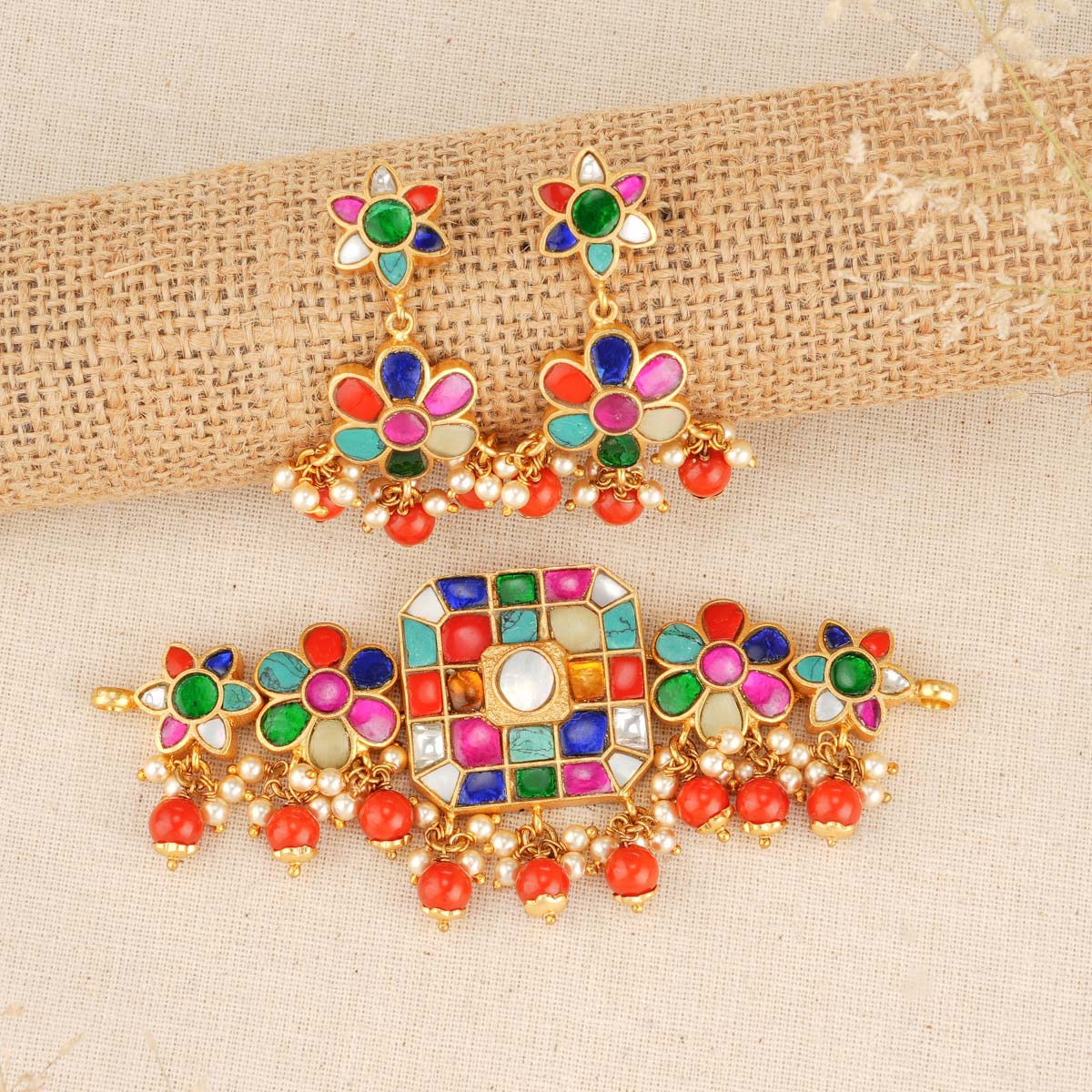 This 92.5 Silver, 24 kt Gold-Plated Mini Choker set is adorned with Semi-precious Kundan Stones for a luxurious aesthetic.