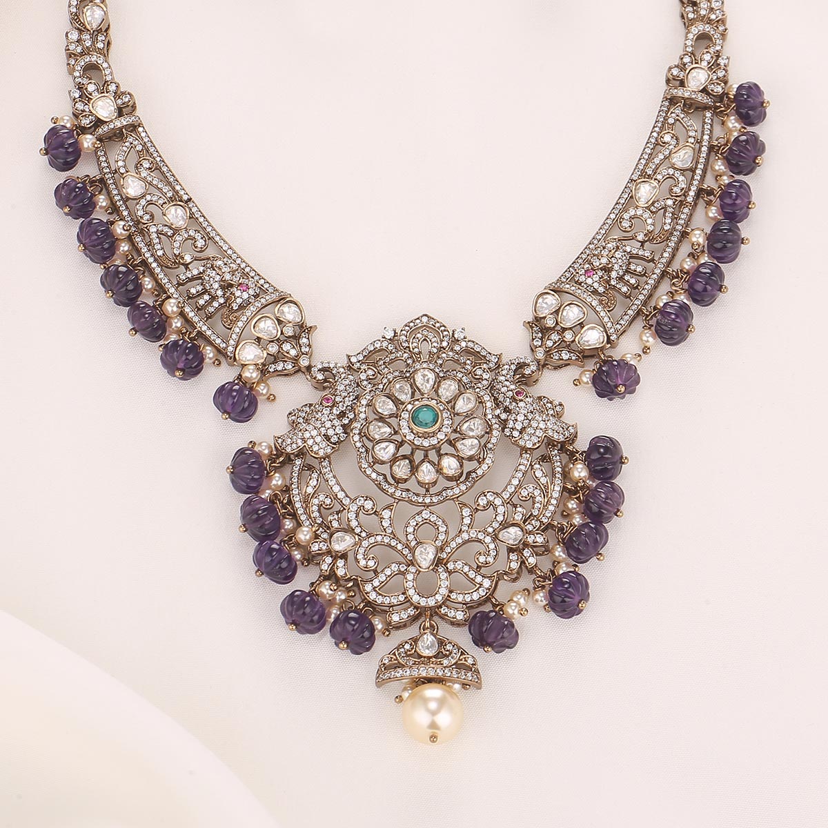 92.5 Silver, Victorian Necklace set studded with Gem Stones and Pearl Beads.