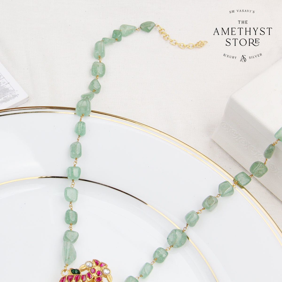 This 92.5 Silver, 24 kt Gold-Plated Necklace is adorned with Semi-precious Kundan Stones for a luxurious aesthetic.