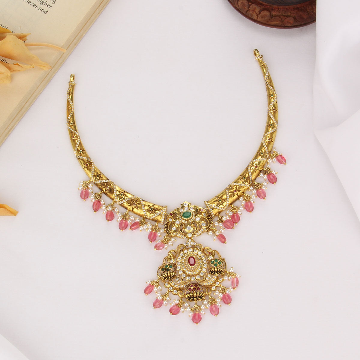 This 92.5 Silver, 24 kt Gold-Plated Short Necklace is adorned with Semi-precious Stones for a luxurious aesthetic.