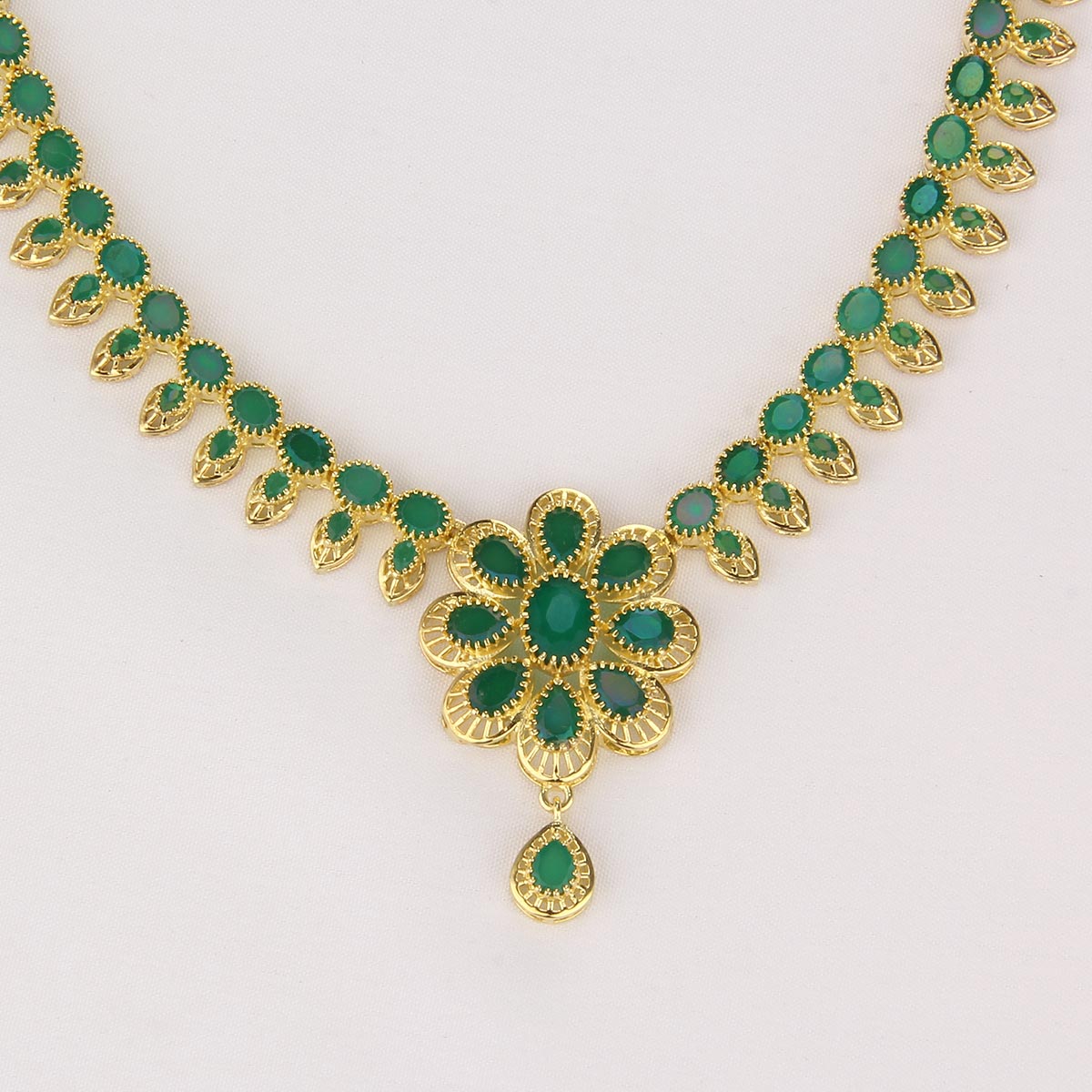 This 92.5 Silver, 24 kt Gold-Plated Short Necklace Set is adorned with Semi-precious Stones for a luxurious aesthetic.