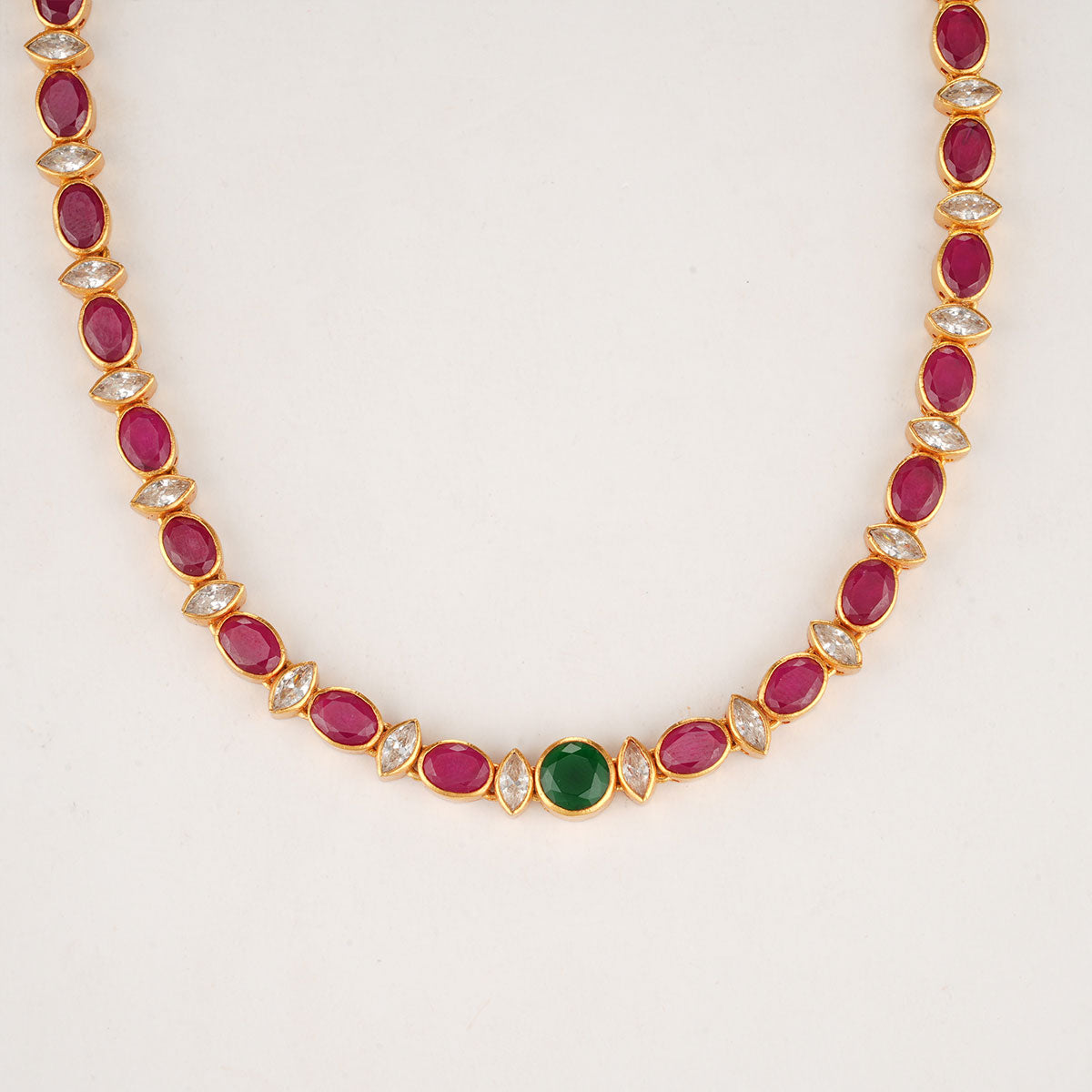 This 92.5 Silver, 24 kt gold-plated stylish Necklace is studded with semi-precious stones to make a stunning statement. Perfect for any special occasion.