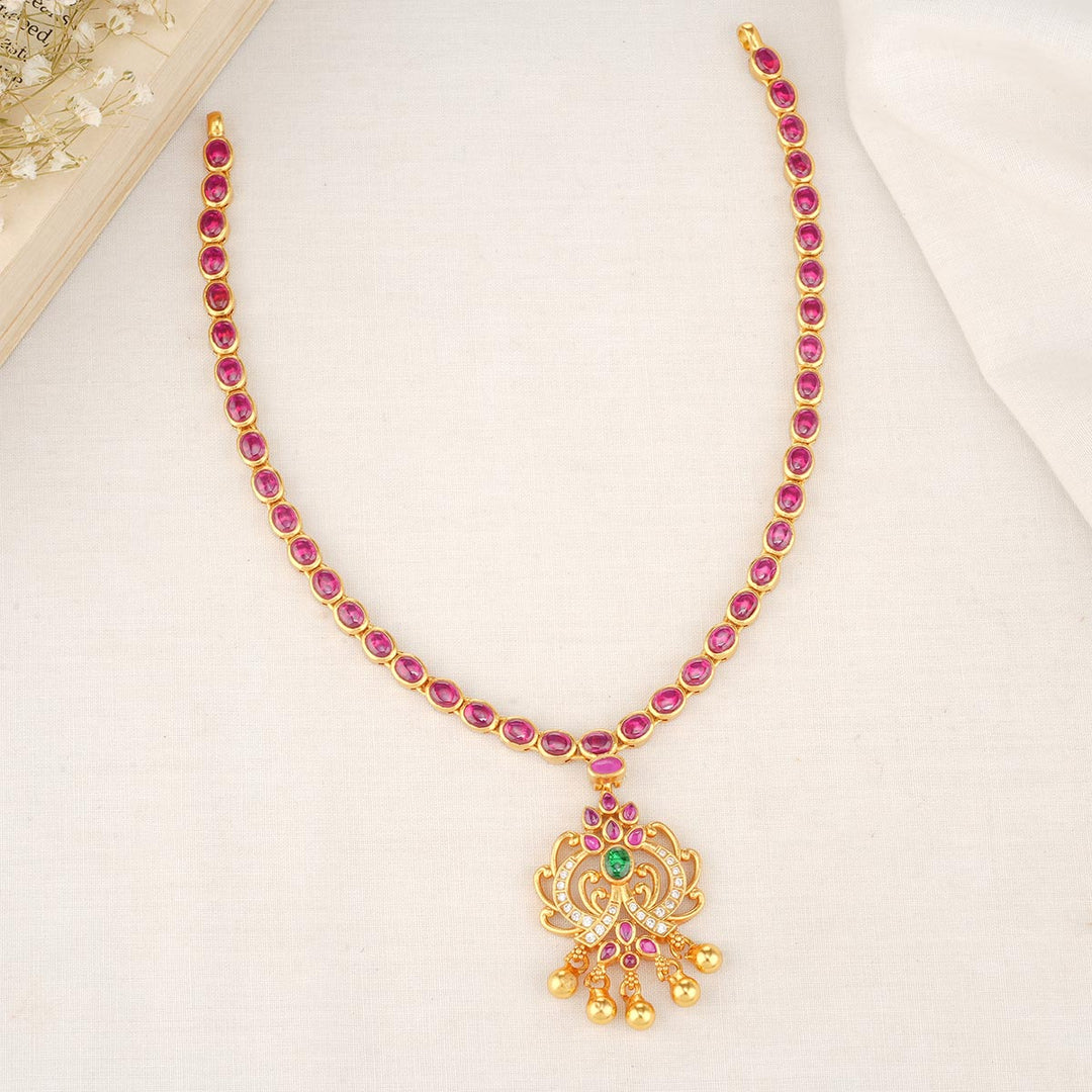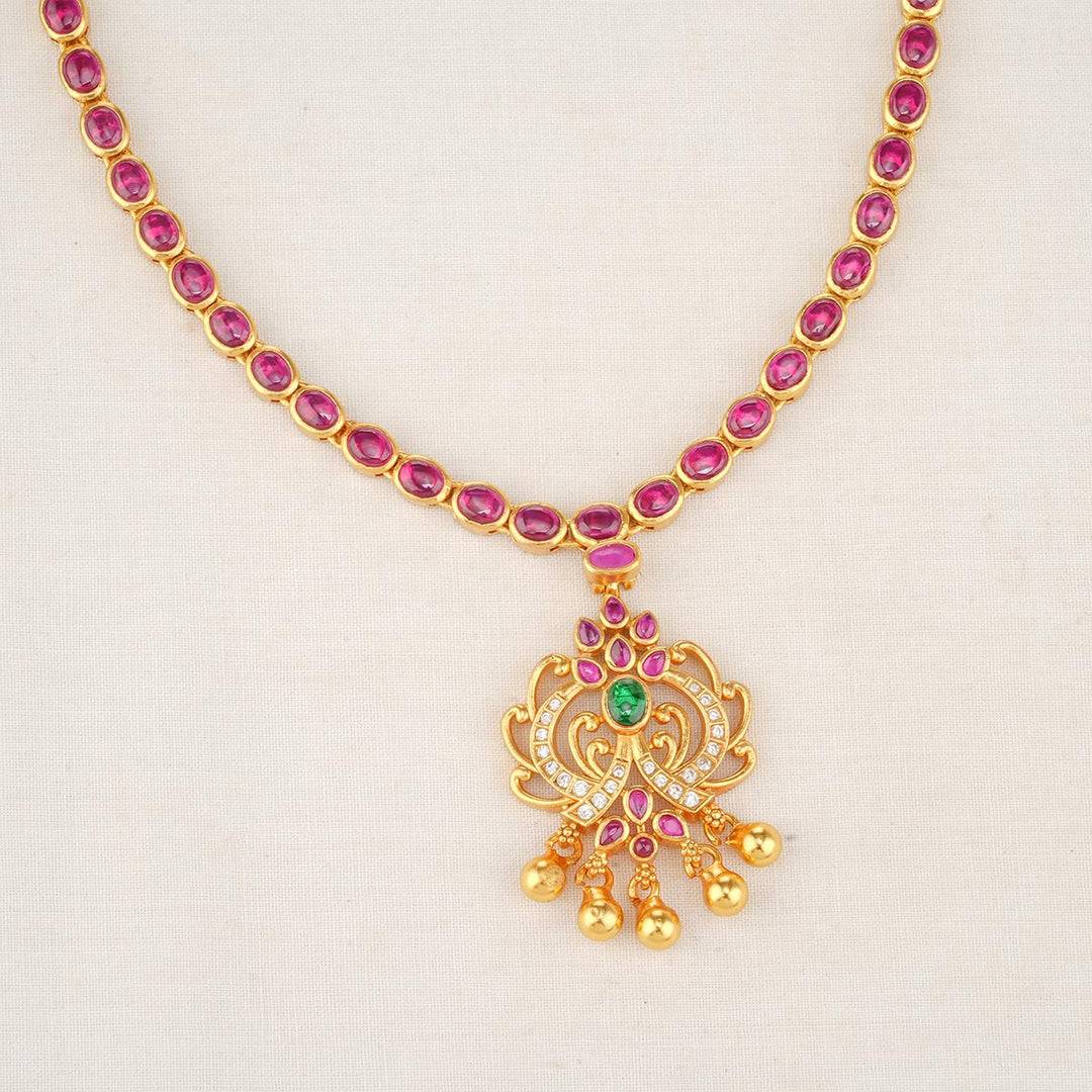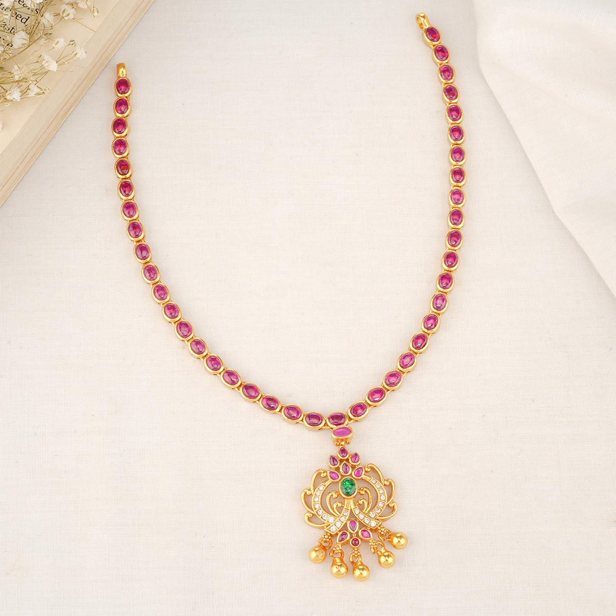 This 92.5 Silver, 24 kt gold-plated stylish Necklace is studded with semi-precious stones to make a stunning statement. Perfect for any special occasion.