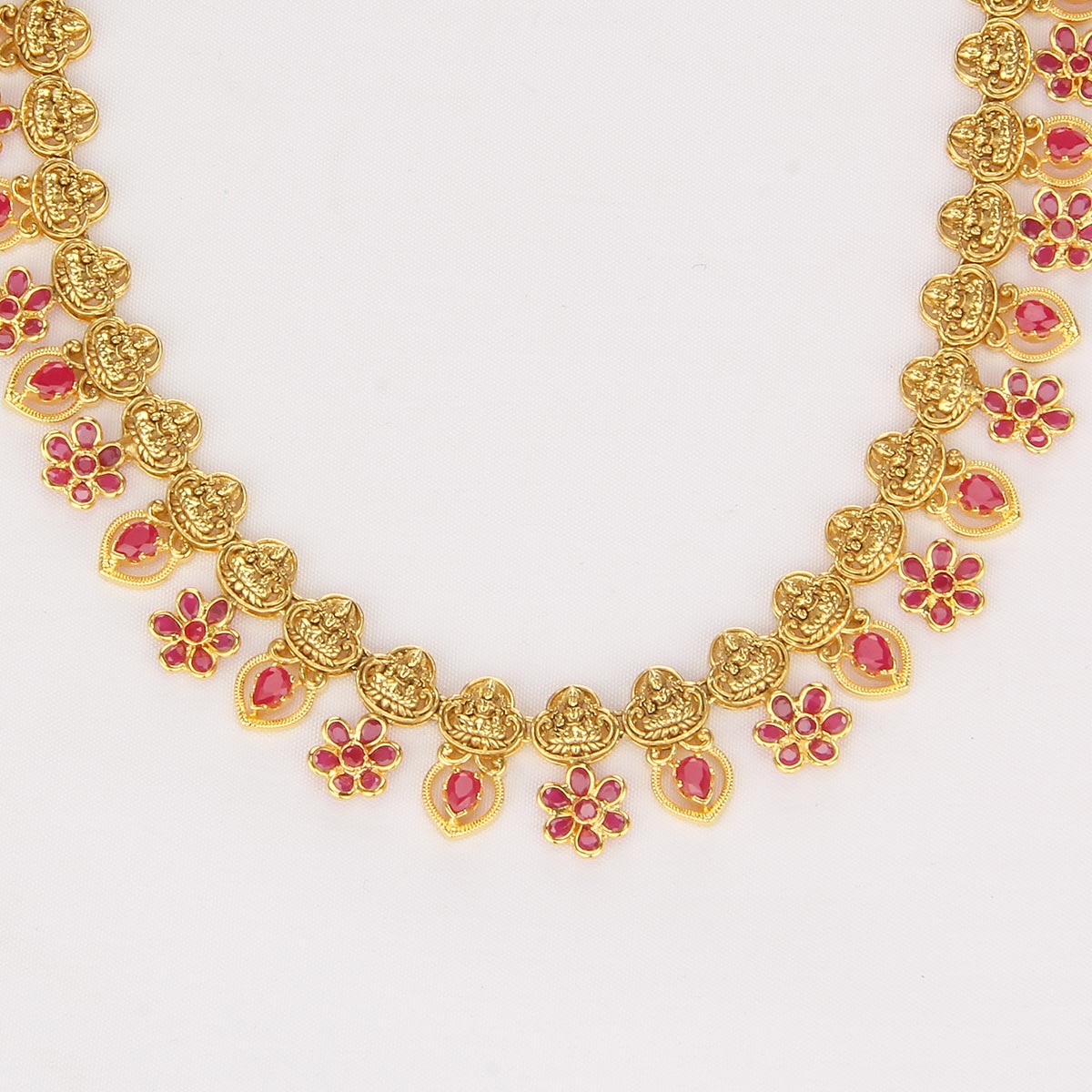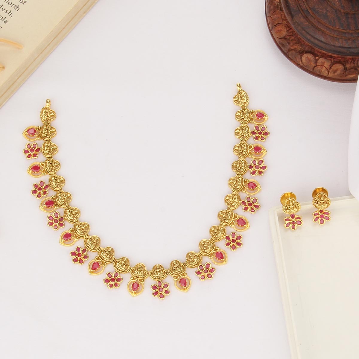 This 92.5 Silver, 24 kt Gold-Plated Short Necklace Set is adorned with Semi-precious Stones for a luxurious aesthetic.