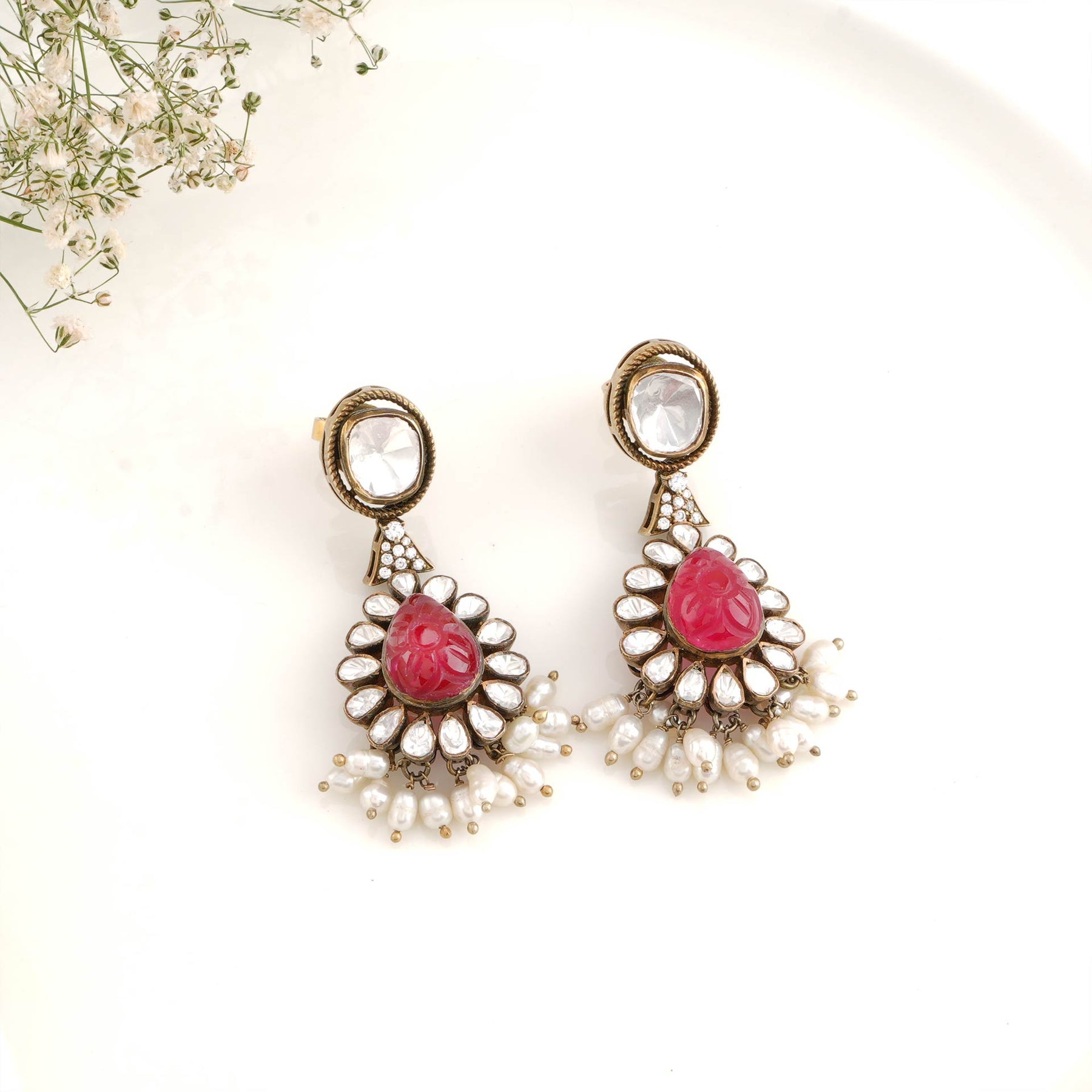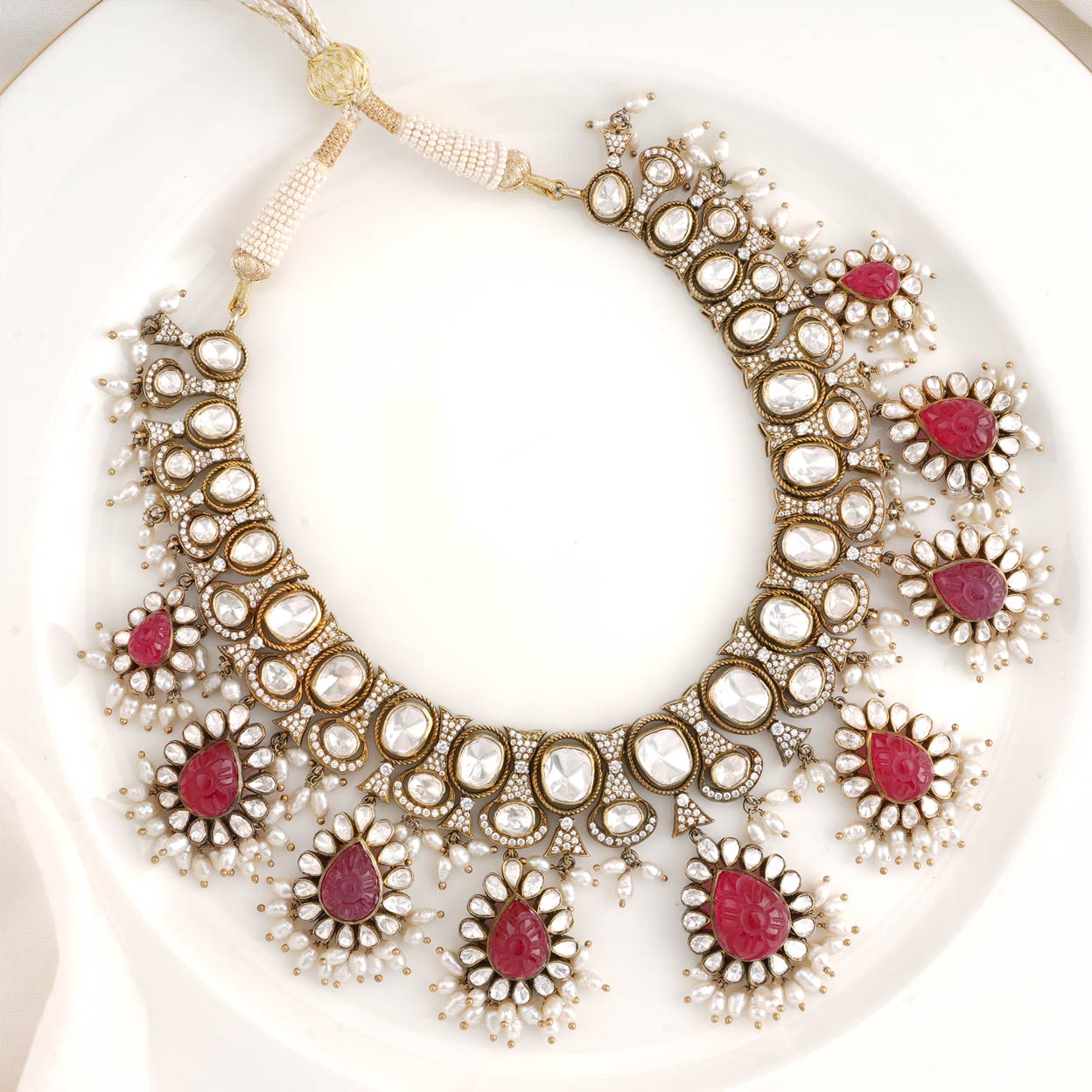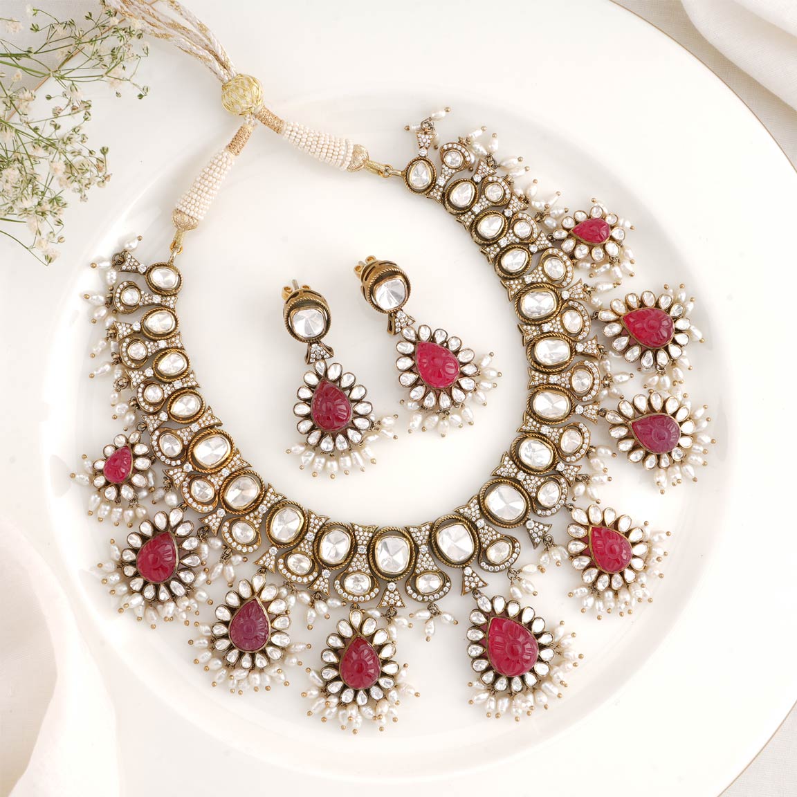 92.5 Silver, Victorian Necklace set studded with Gem Stones and Pearl Beads.