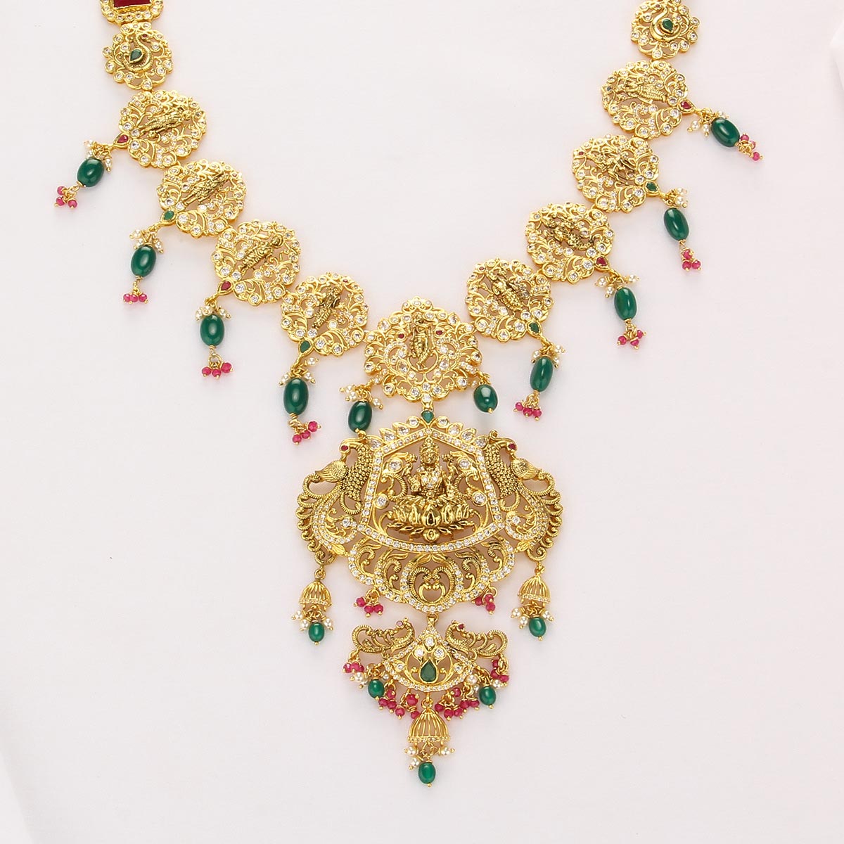 This 92.5 Silver, 24 kt Gold-Plated Long Necklace is adorned with Semi-precious Stones for a luxurious aesthetic.