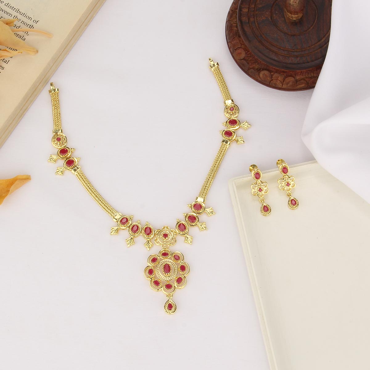 This 92.5 Silver, 24 kt Gold-Plated Short Necklace Set is adorned with Semi-precious Stones for a luxurious aesthetic.