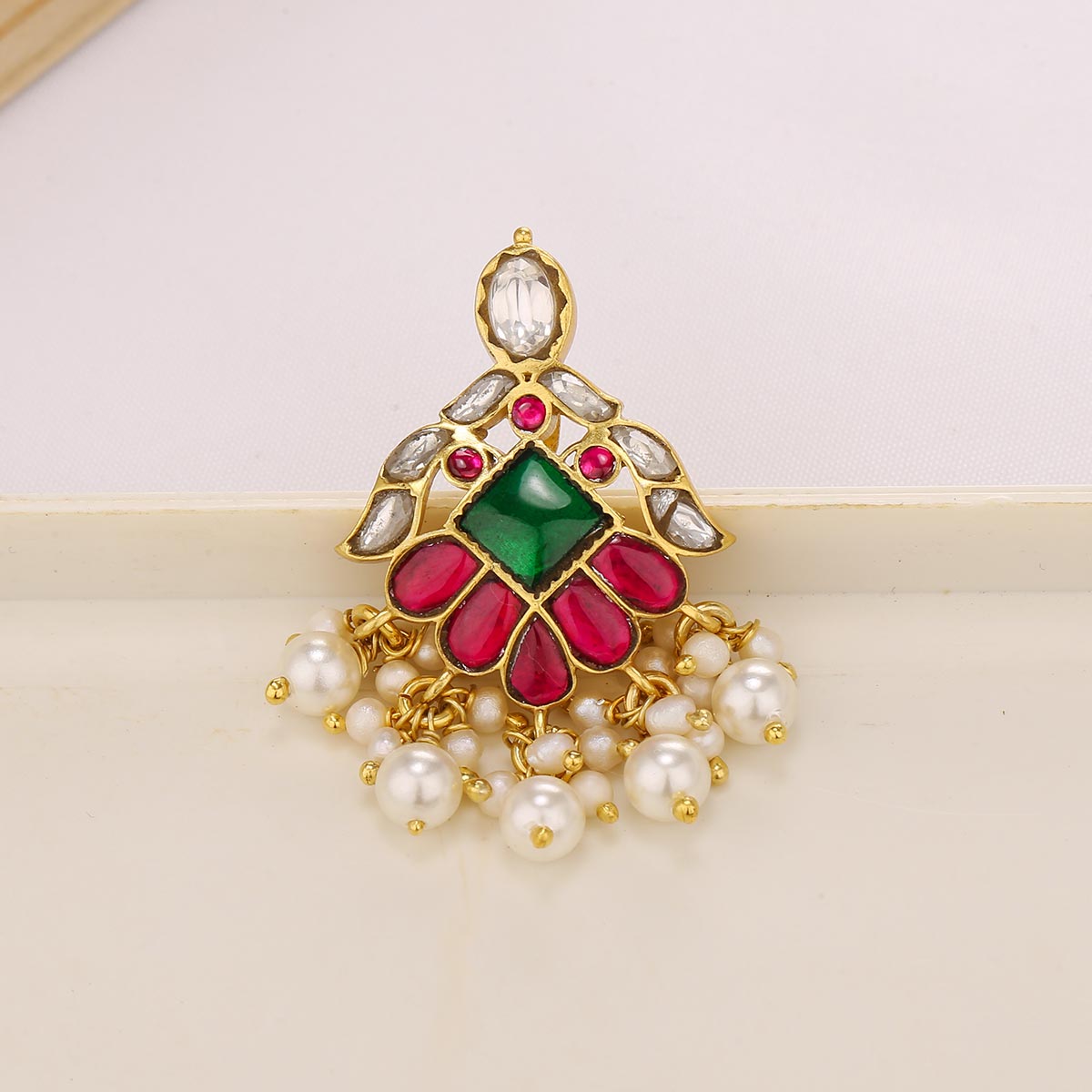 This 92.5 Silver, 24 kt Gold-Plated Pendant is adorned with Semi-precious Kundan Stones for a luxurious aesthetic.