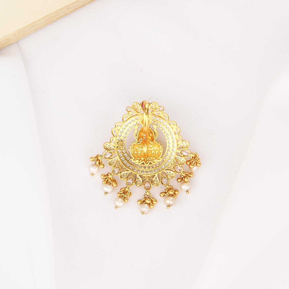 This Nagas Nakshi pendant is handcrafted in 92.5 silver and plated with 24kt gold. It is finely detailed with semi-precious stones, adding a subtle sparkle and perfect finishing touch.