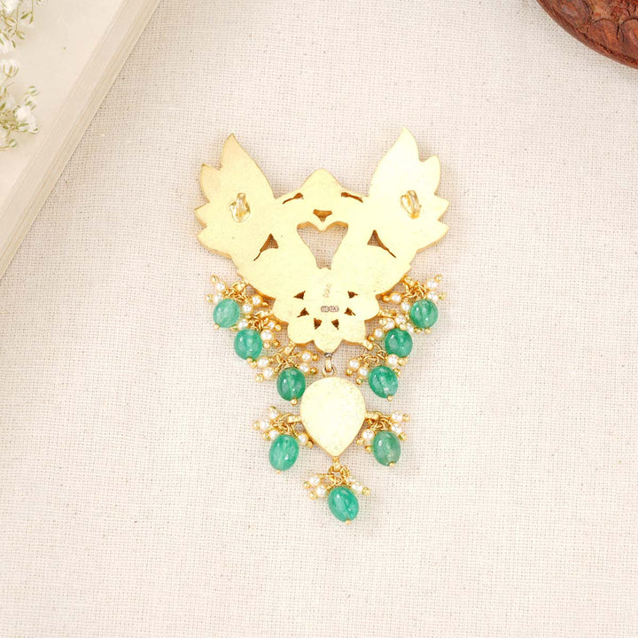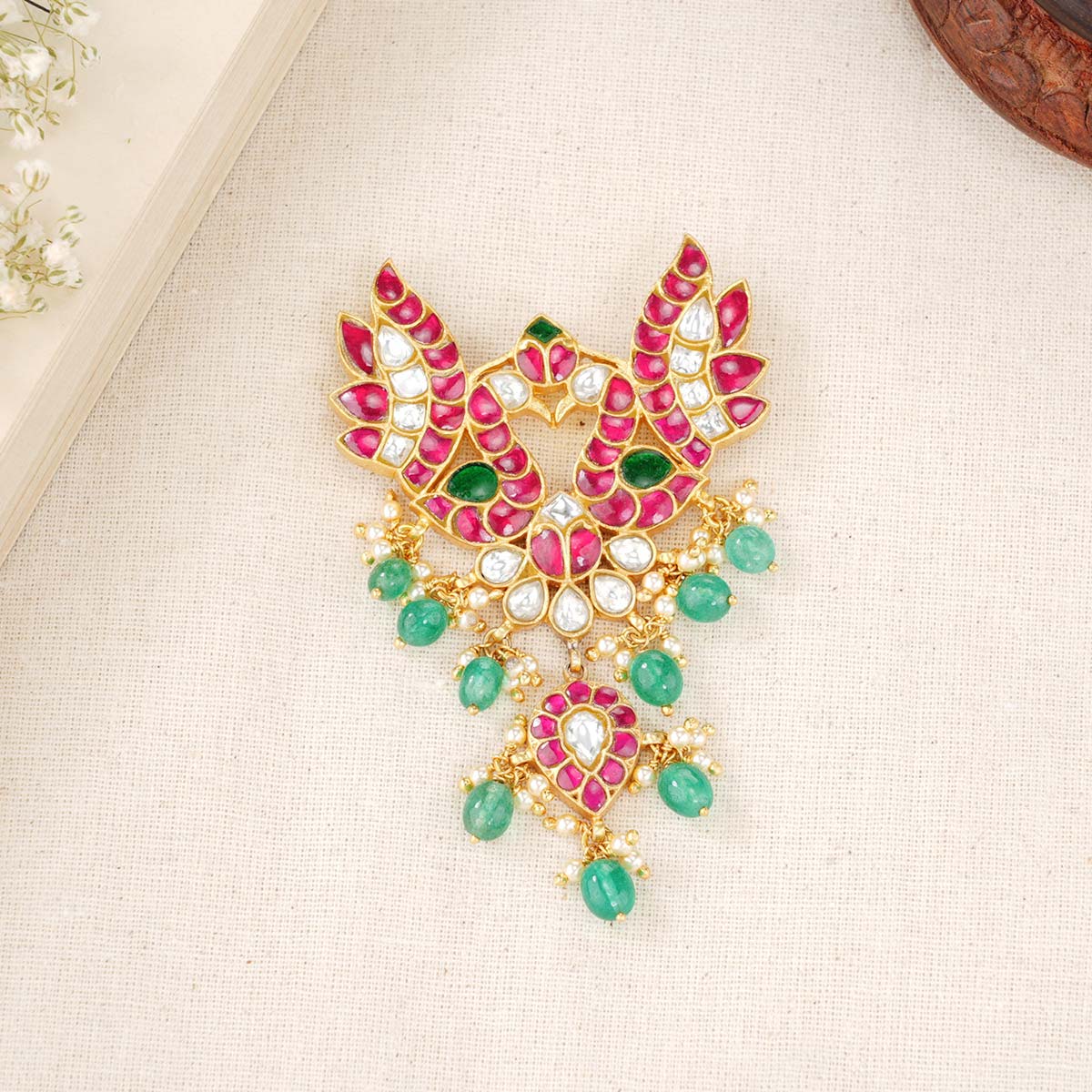 This 92.5 Silver, 24 kt Gold-Plated Pendant is adorned with Semi-precious Kundan Stones for a luxurious aesthetic.