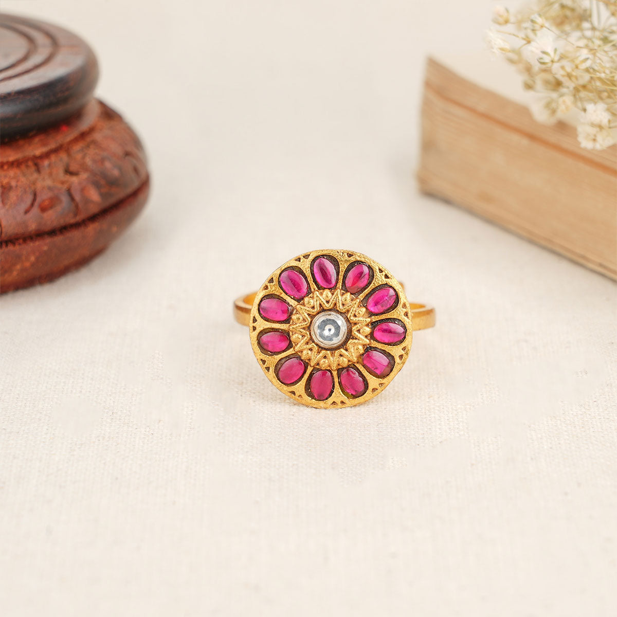 This 92.5 Silver, 24 kt Gold-Plated Ring is adorned with Semi-precious Kundan Stones for a luxurious aesthetic.