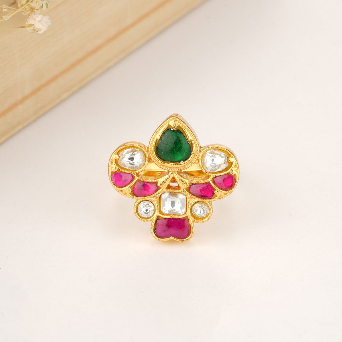 This 92.5 Silver, 24 kt Gold-Plated Ring is adorned with Semi-precious Kundan Stones for a luxurious aesthetic.