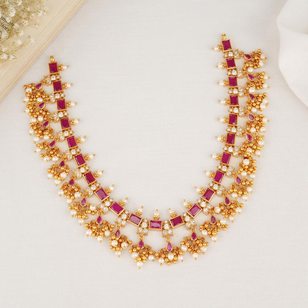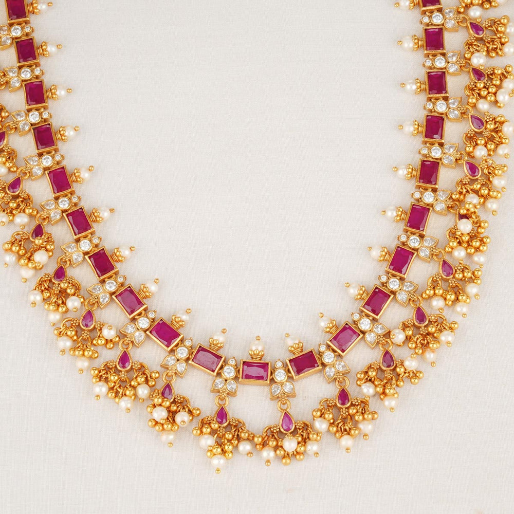 This necklace is crafted from 92.5 Sterling Silver and features 24-karat gold plating as well as semiprecious stones.