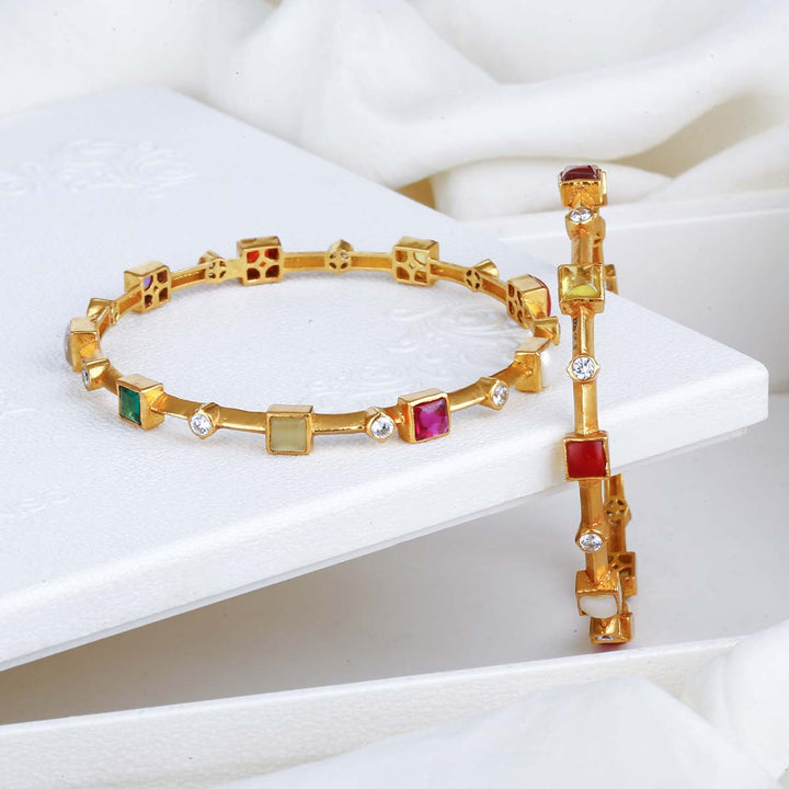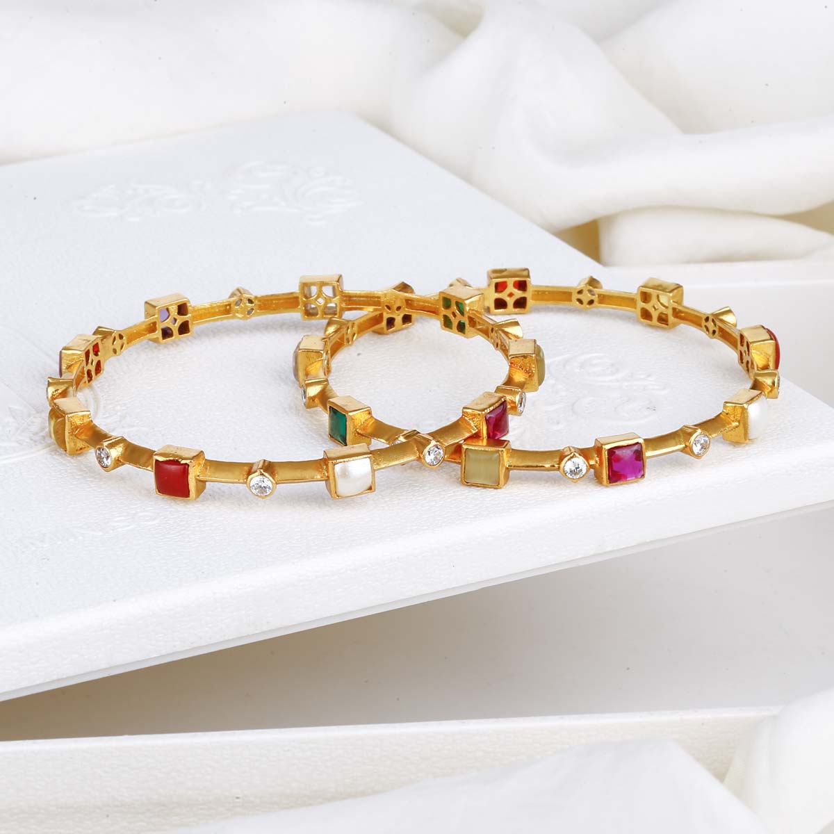 This 92.5 Silver, 24 kt gold-plated stylish Bangles is studded with semi-precious stones to make a stunning statement. Perfect for both formal and casual occasions.