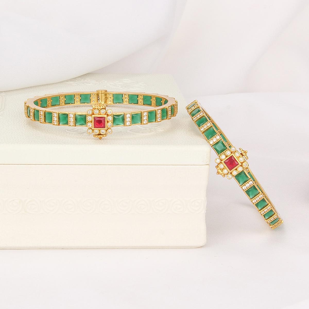 This 92.5 Silver, 24 kt gold-plated stylish Bangles is studded with semi-precious stones to make a stunning statement. Perfect for both formal and casual occasions.