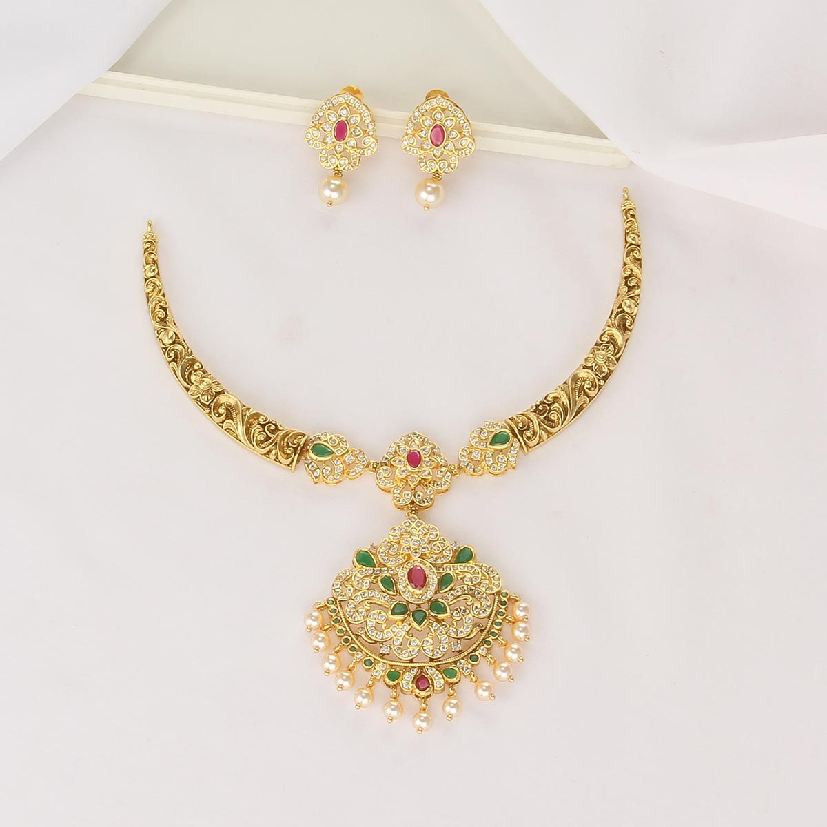 This necklace set is crafted from 92.5 Sterling Silver and features 24-karat gold plating and semiprecious stones.