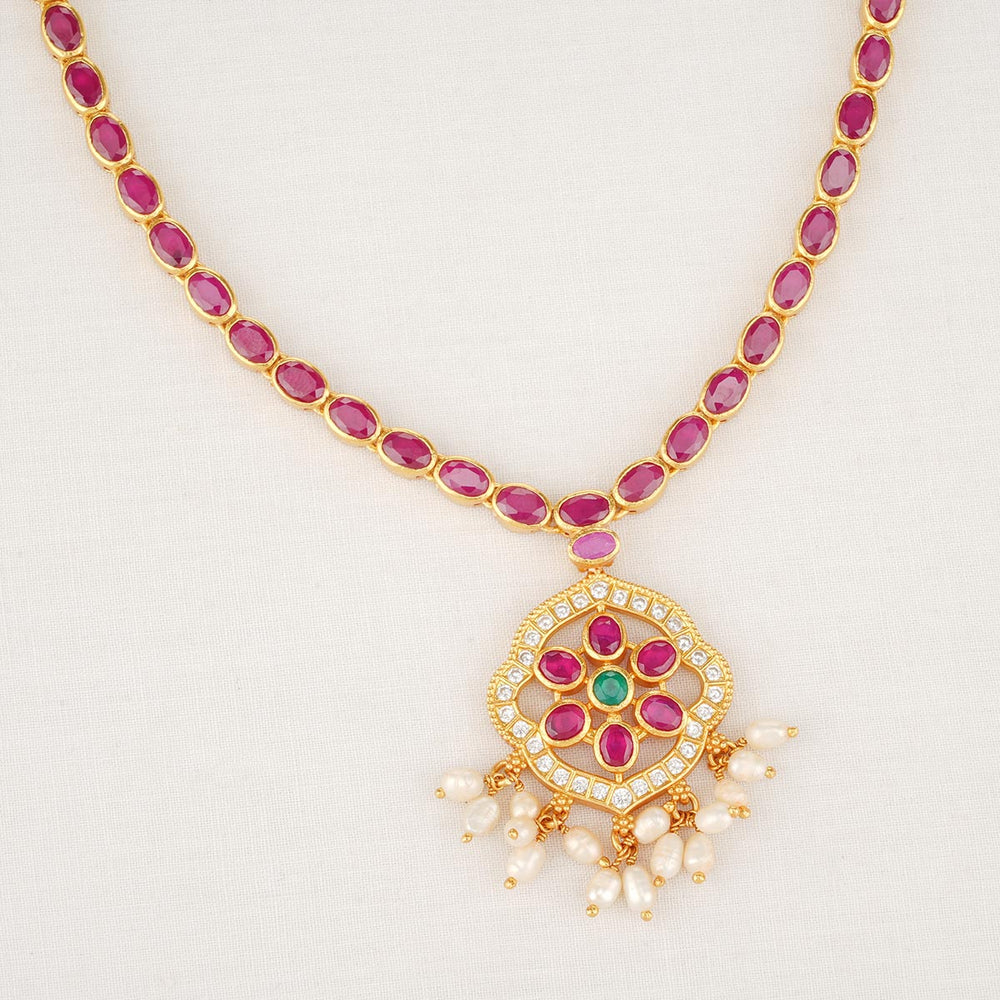 This set of Majestic Look necklaces is crafted from 92.5 Silver, 24kt Gold Plated, and is studded with semi-precious stones for a truly dazzling effect. Unparalleled in design and style, this exquisite set makes a grand statement.