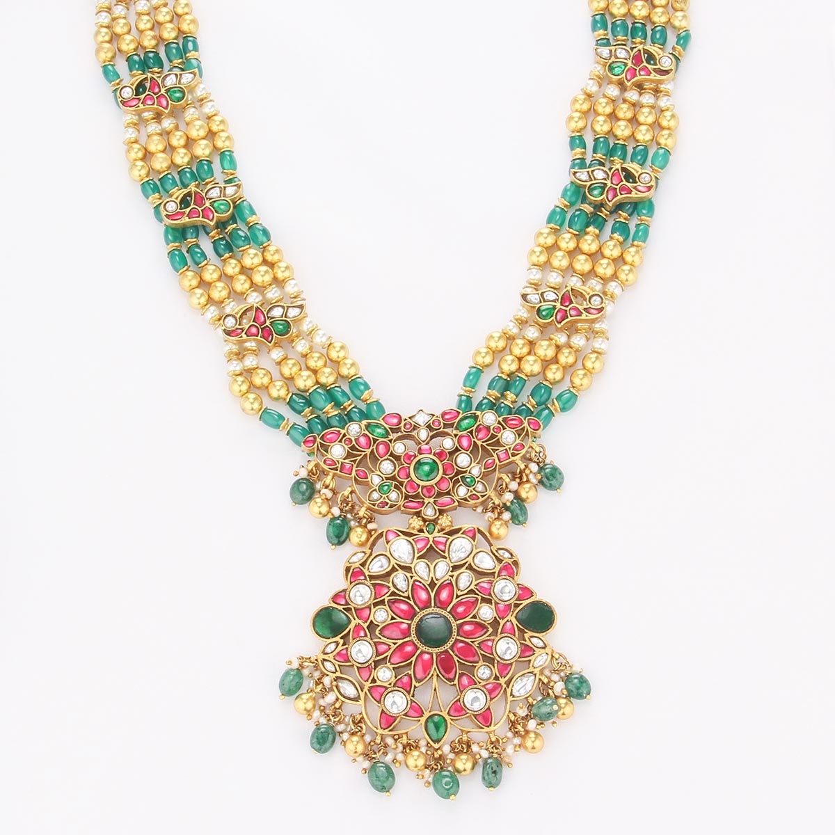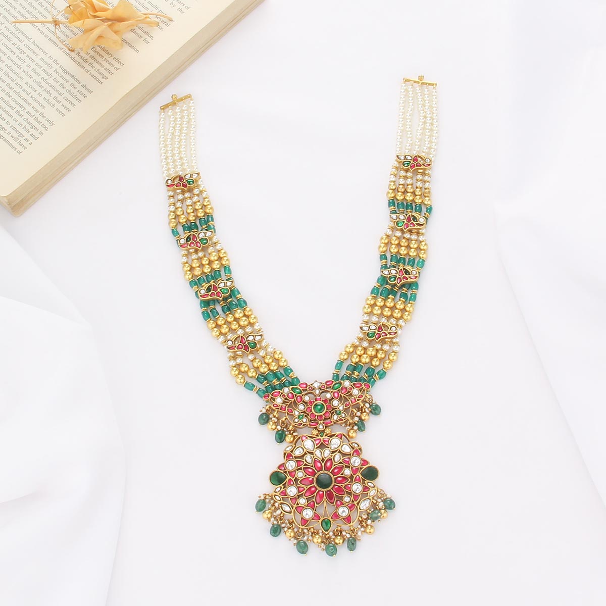 This 92.5 Silver, 24 kt Gold-Plated Necklace is adorned with Semi-precious Kundan Stones for a luxurious aesthetic.