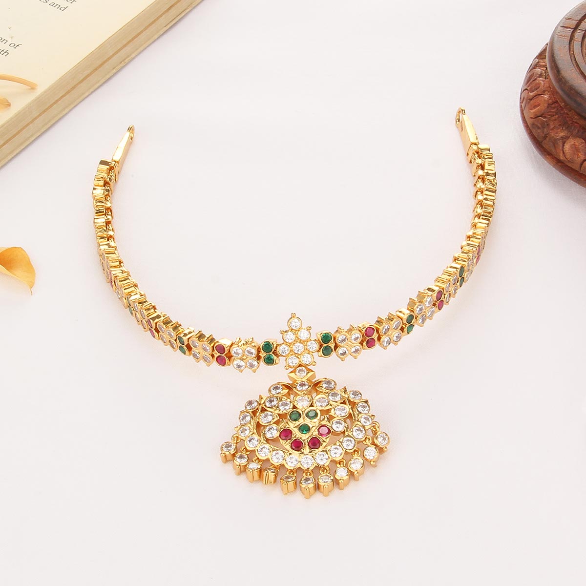 This 92.5 Silver, 24 kt gold-plated, stylish Necklace is studded with semi-precious stones to make a stunning statement. Perfect for any special occasion.