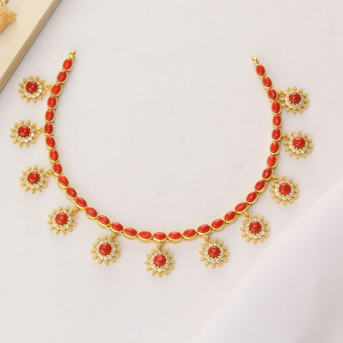 This 92.5 Silver, 24kt gold-plated, stylish Necklace is studded with semi-precious stones to make a stunning statement. Perfect for any special occasion.