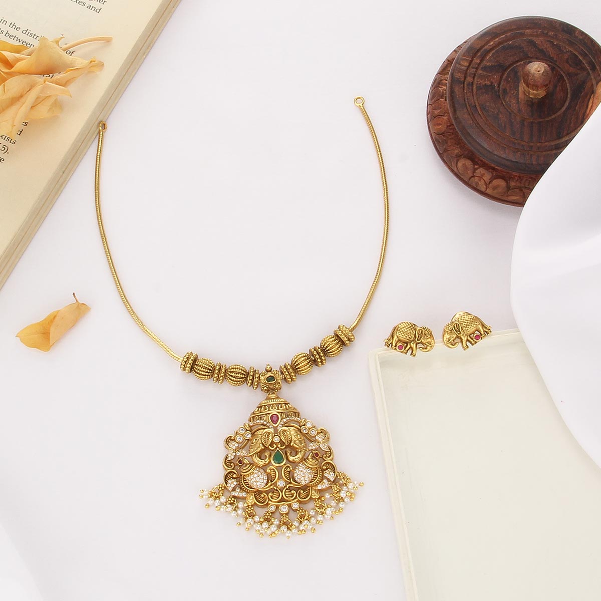 This necklace set is crafted from 92.5 Sterling Silver and features 24-karat gold plating and semiprecious stones.