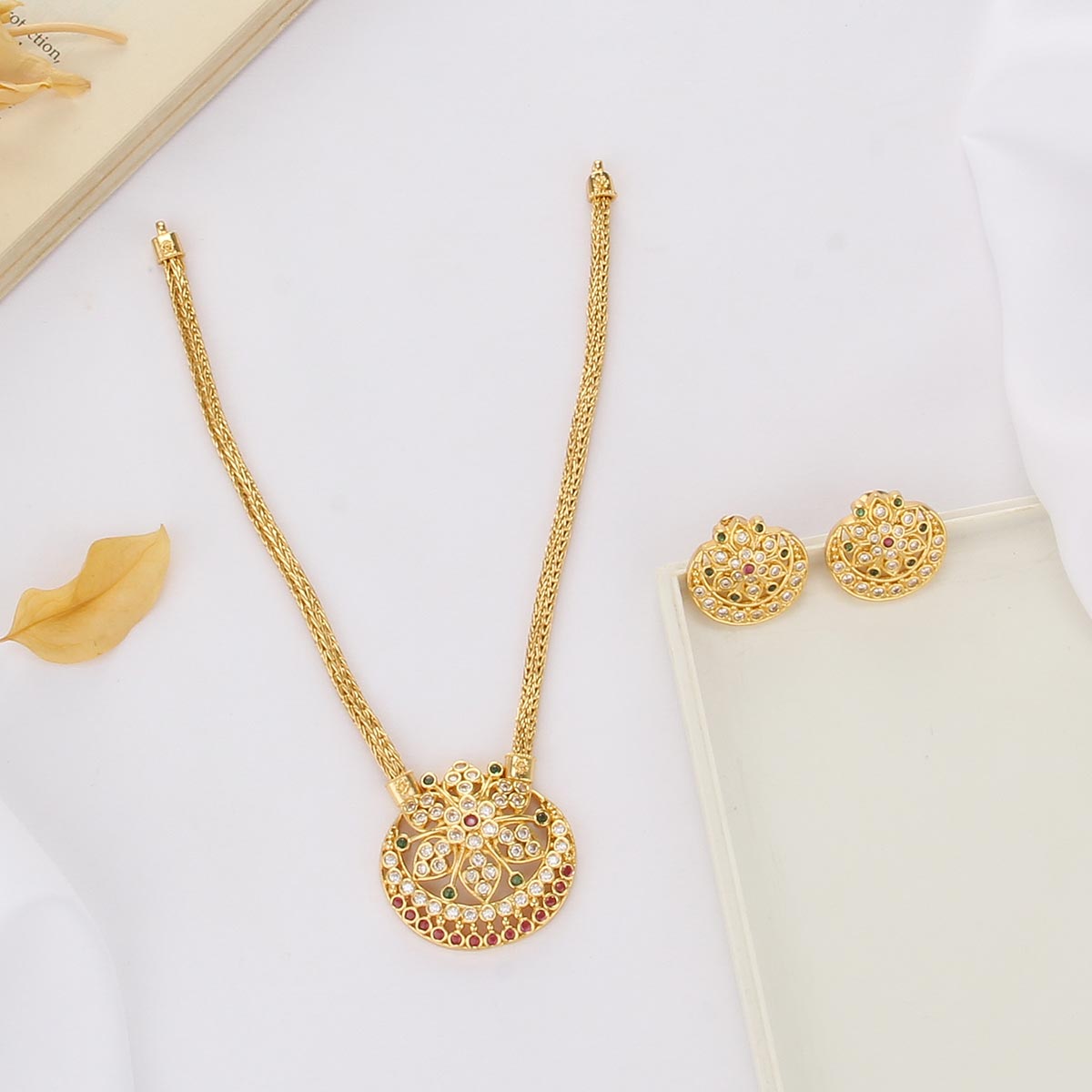 This necklace set is crafted from 92.5 Sterling Silver and features 24-karat gold plating and semiprecious stones.