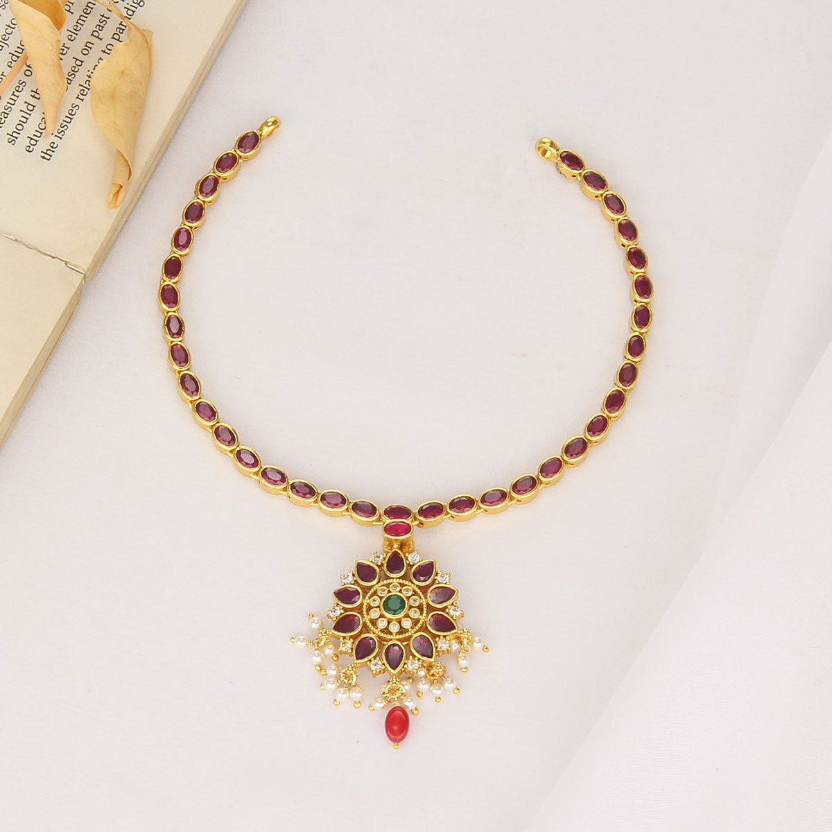 This 92.5 Silver, 24 kt gold-plated, stylish Necklace is studded with semi-precious stones to make a stunning statement. Perfect for any special occasion.